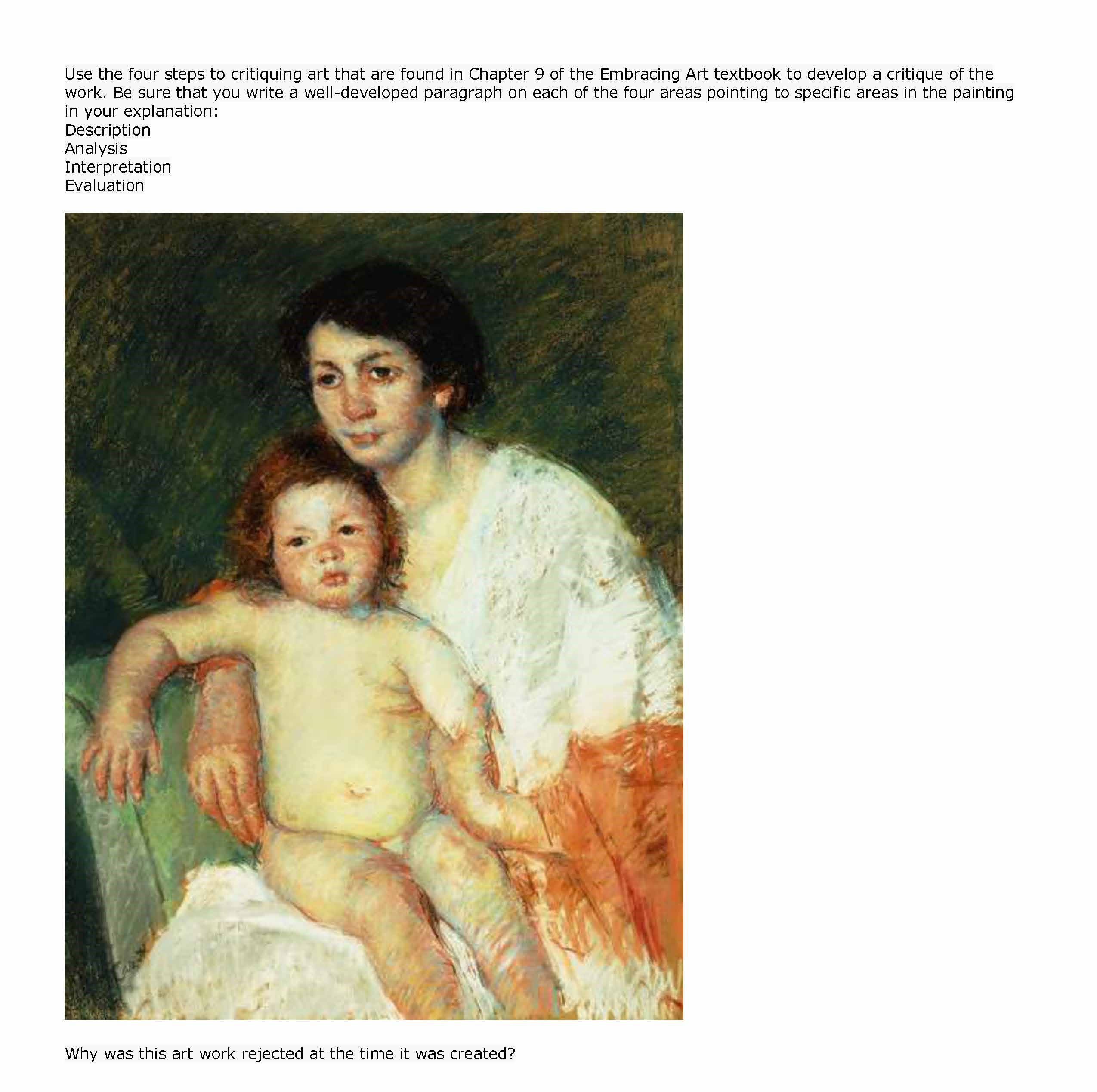 Use the four steps to critiquing art that are found in Chapter 9 of...