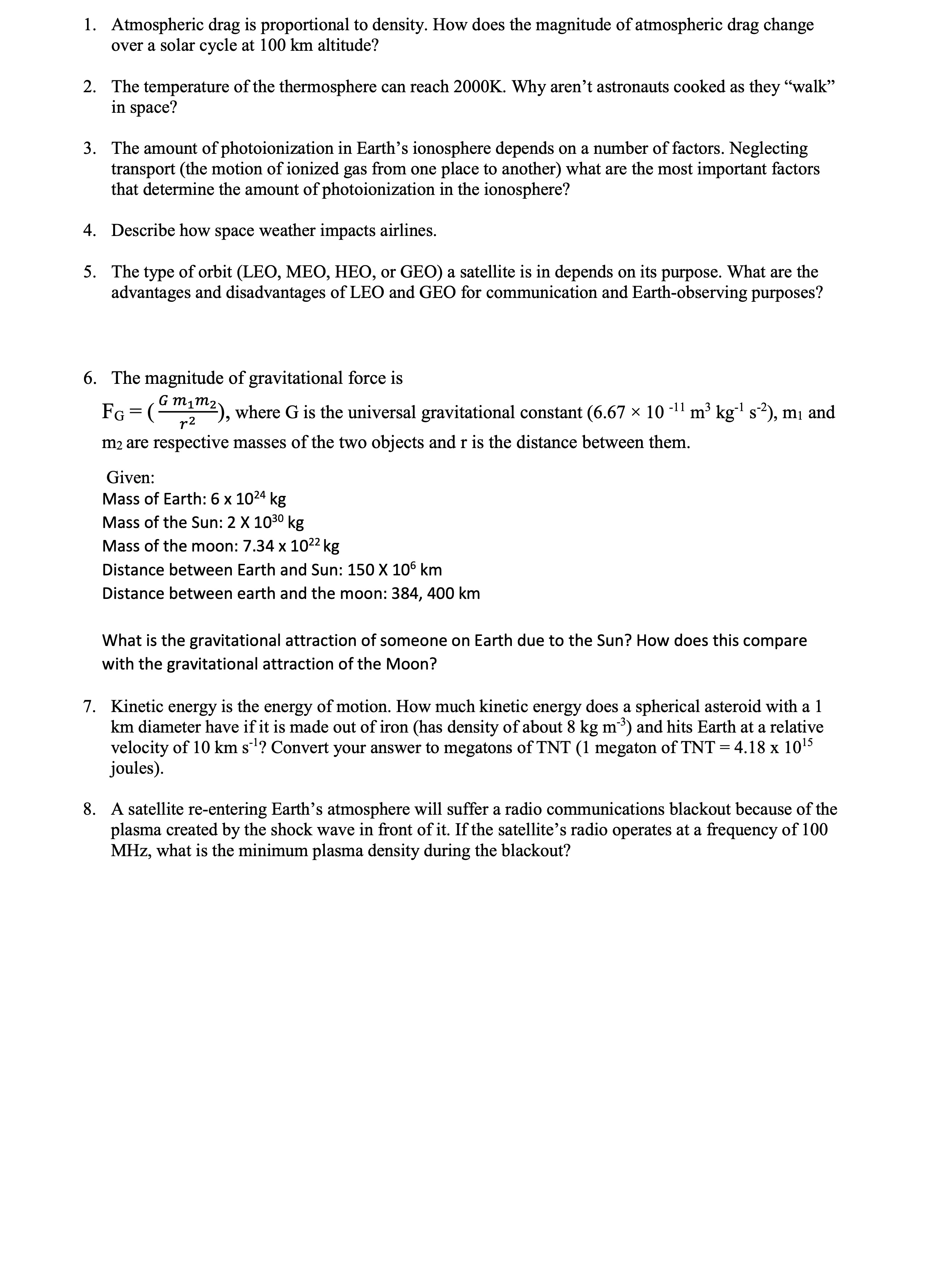 1. Atmospheric drag is proportional to density. How does the magni...