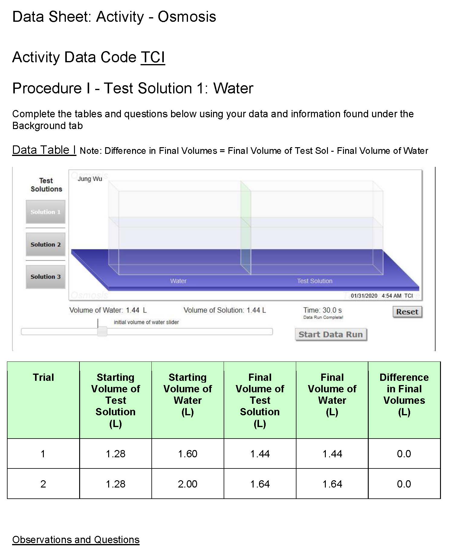 Data Sheet: Activity - Osmosis Activity Data Code TCI Procedure I...