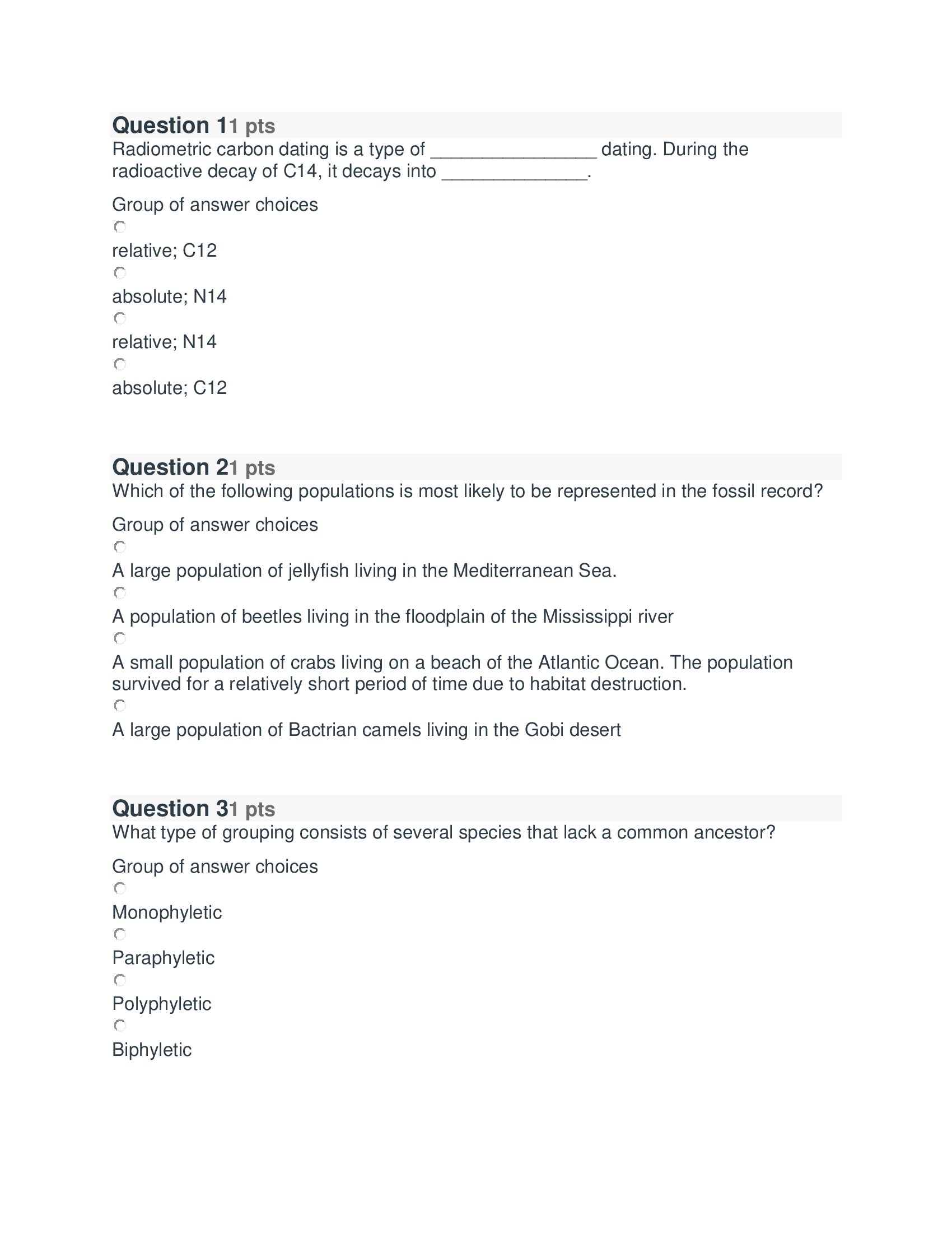 Question 11 pts Radiometric carbon dating is a type of dating. Du...