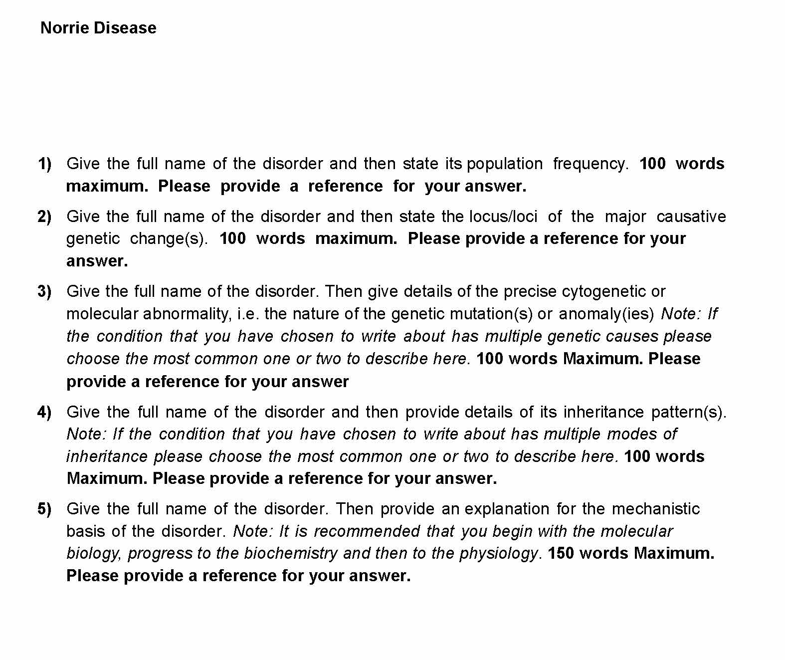 Norrie Disease 1) Give the full name of the disorder and then stat...