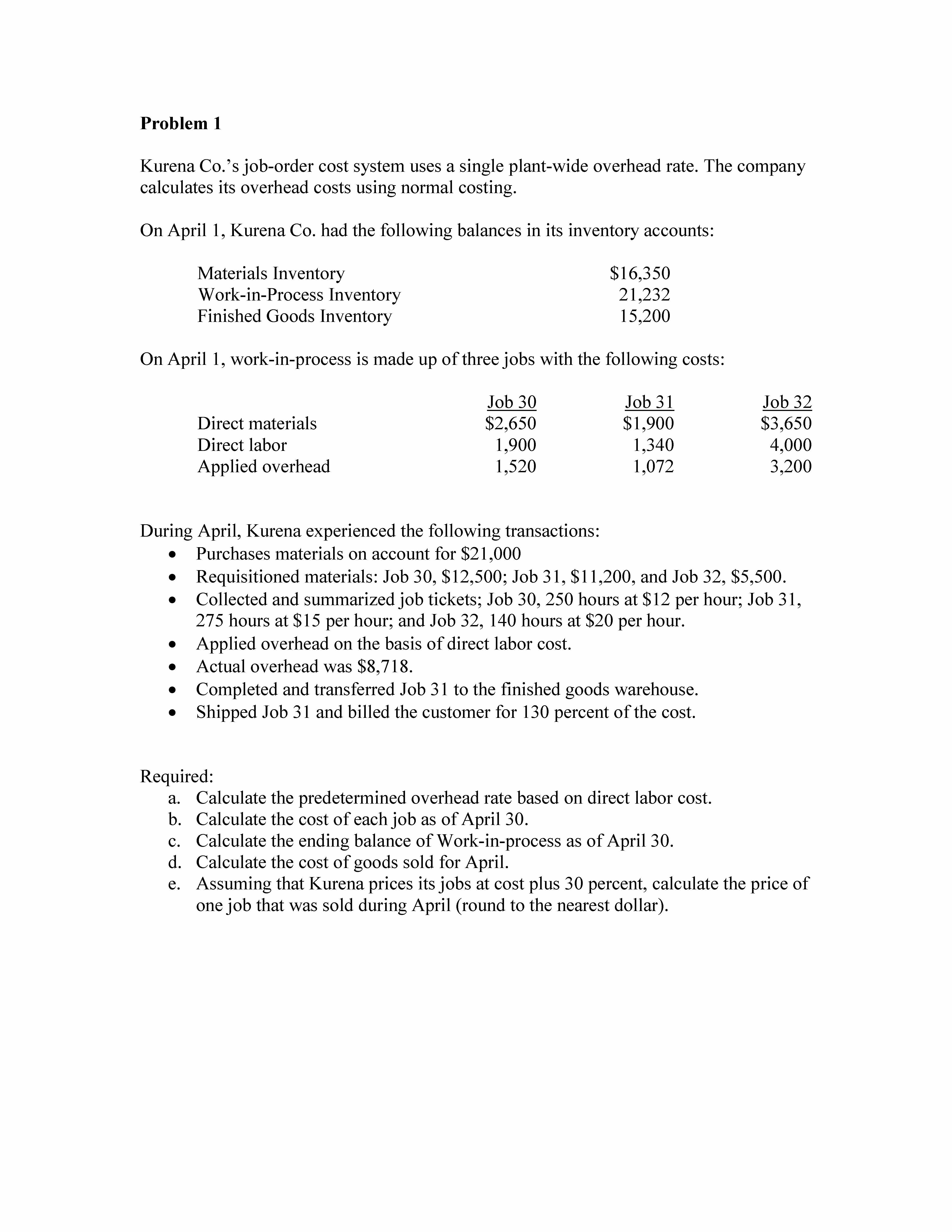 Problem 1 Kurena Co.’s job-order cost system uses a single ...