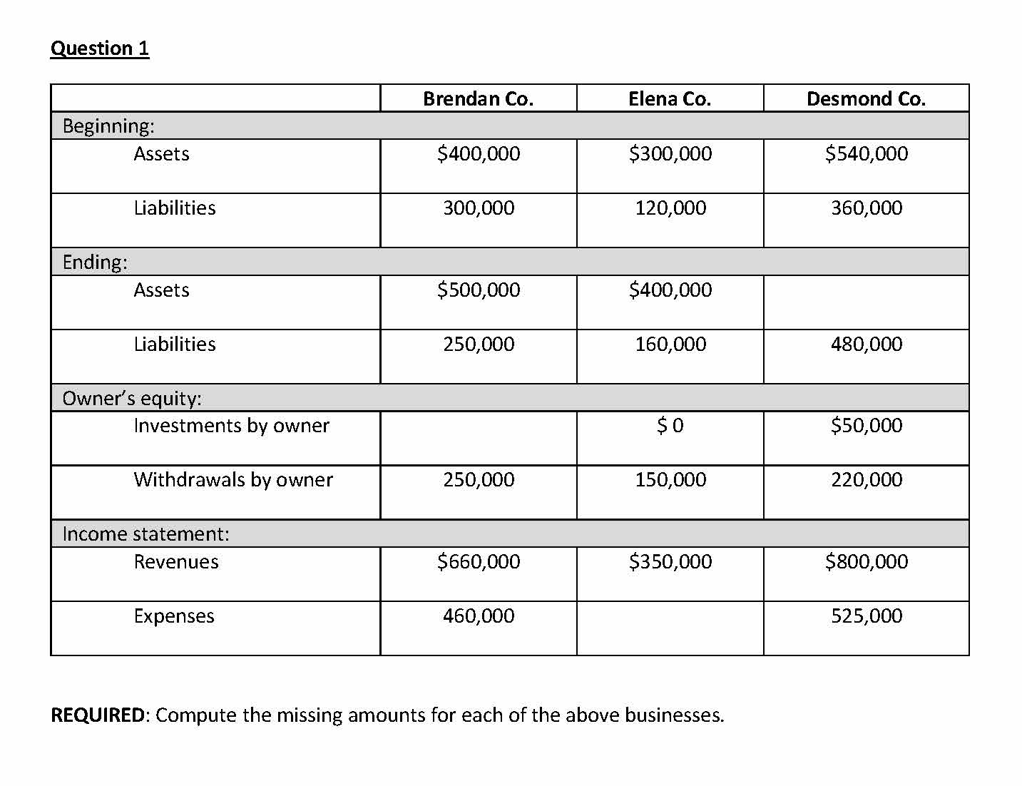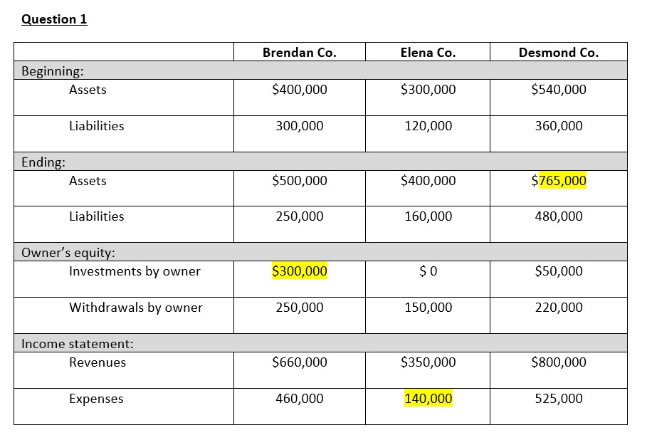Question 1 Brendan Co. Elena Co. Desmond Co. Beginning: Assets...