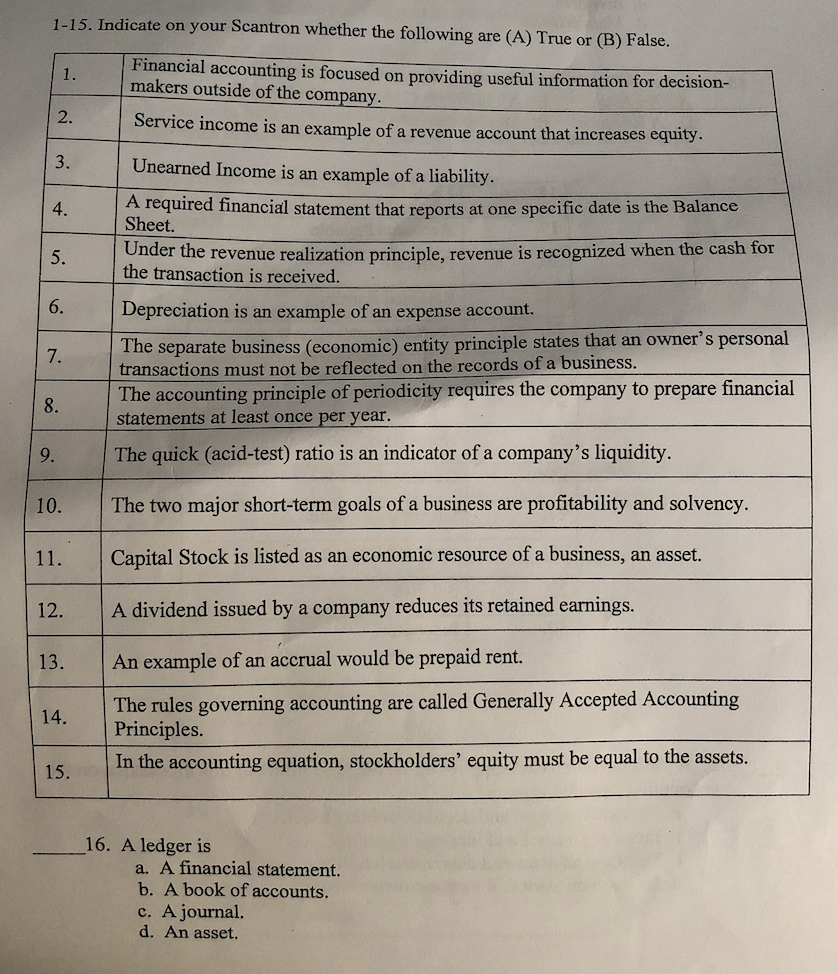 1-15. Indicate on your Scantron whether the following are (A) True ...