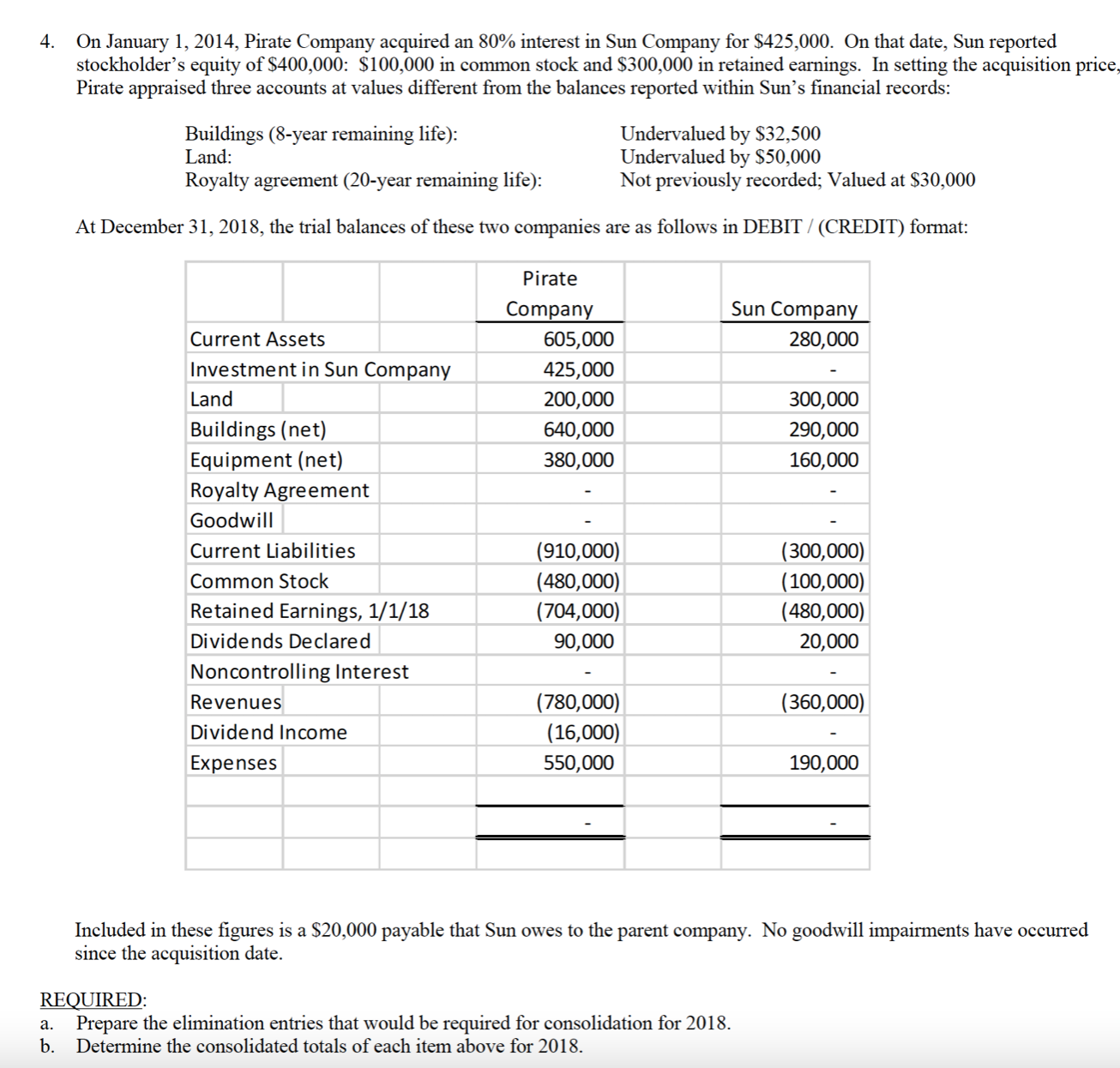 4. On January 1, 2014, Pirate Company acquired an 80% interest in...