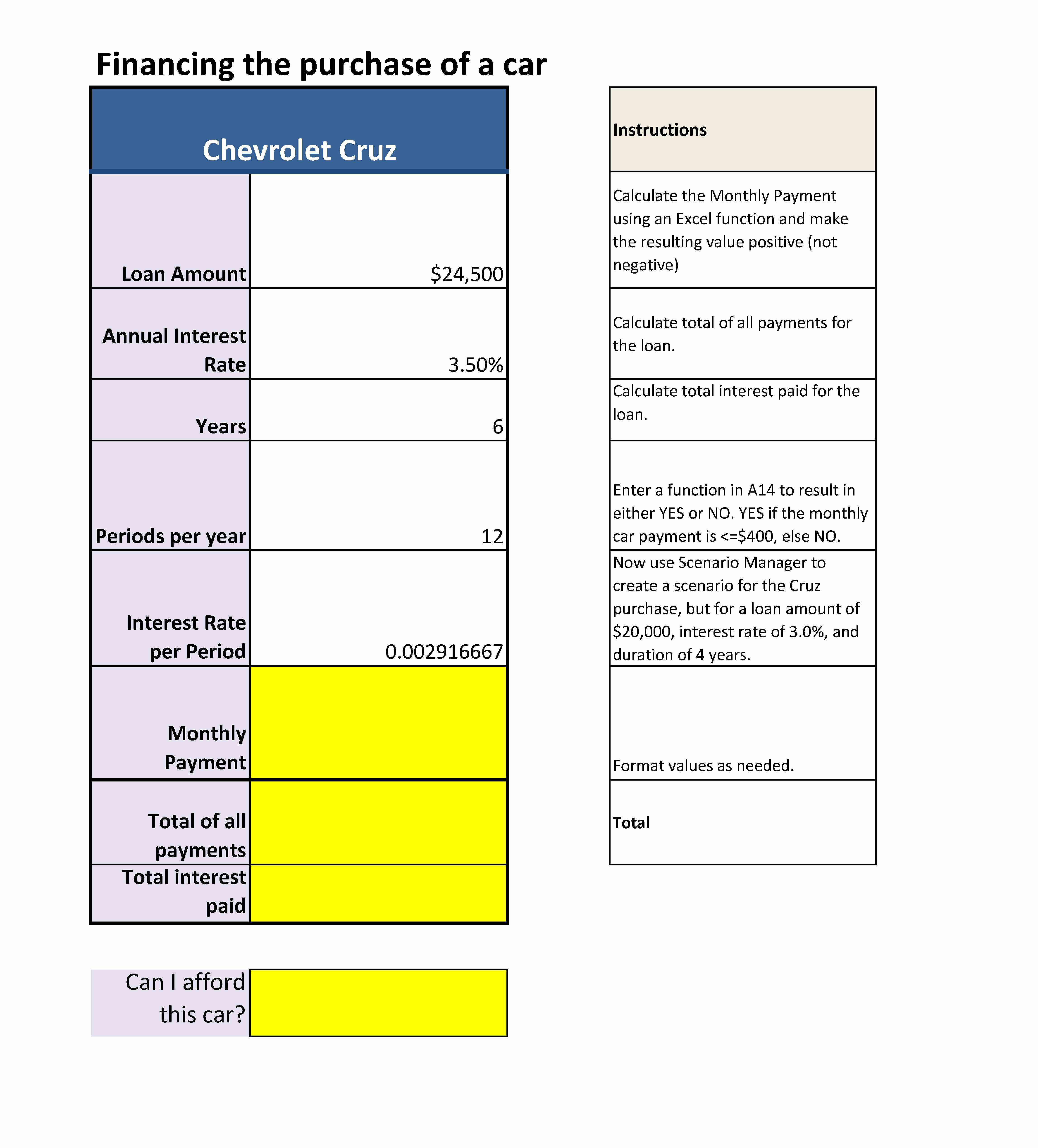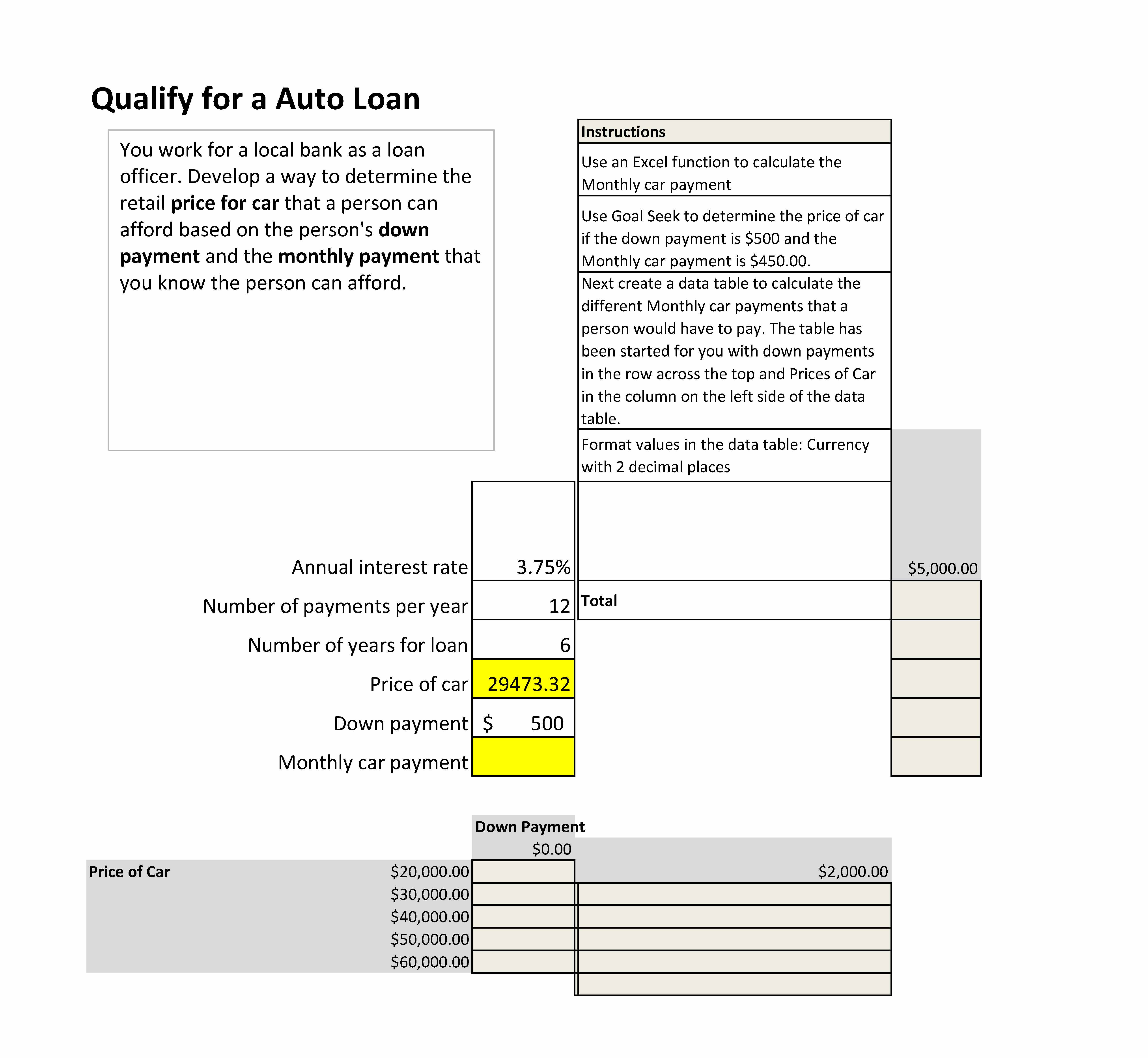 Qualify for a Auto Loan Instructions Use an Excel function to cal...