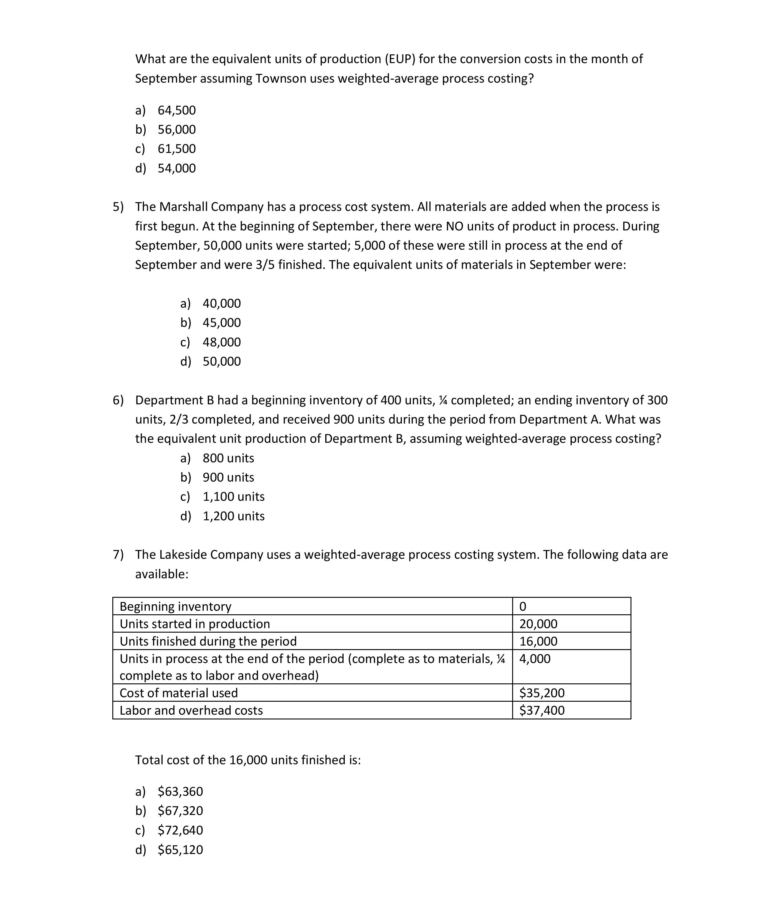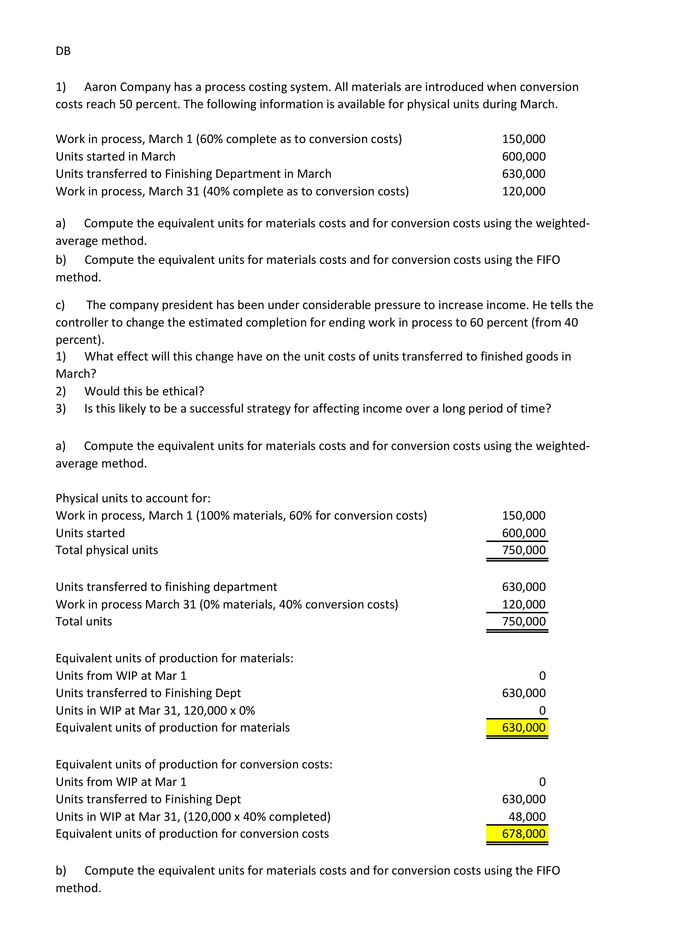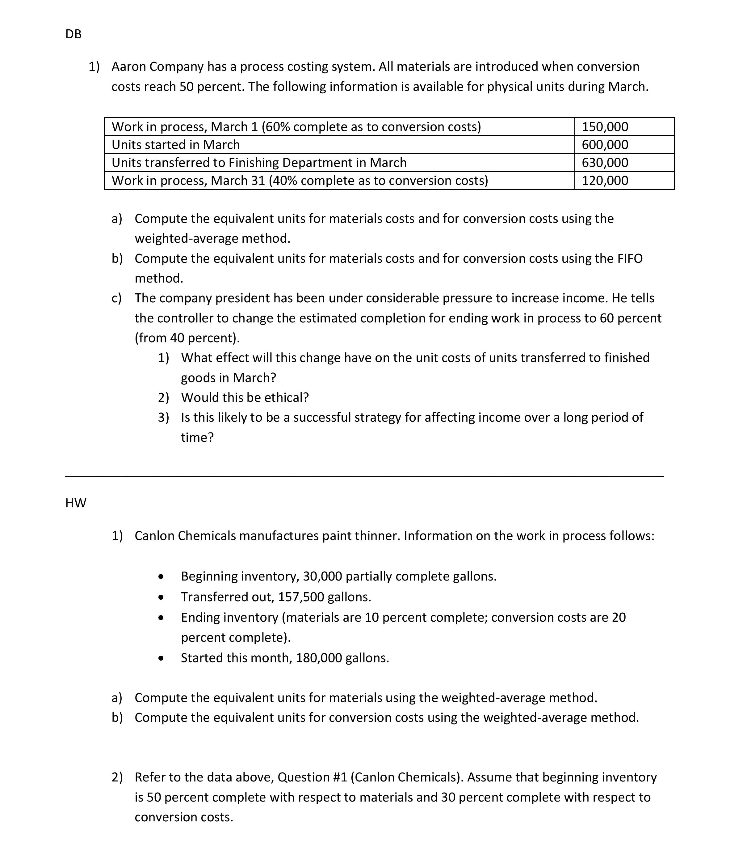 DB 1) Aaron Company has a process costing system. All materials ar...