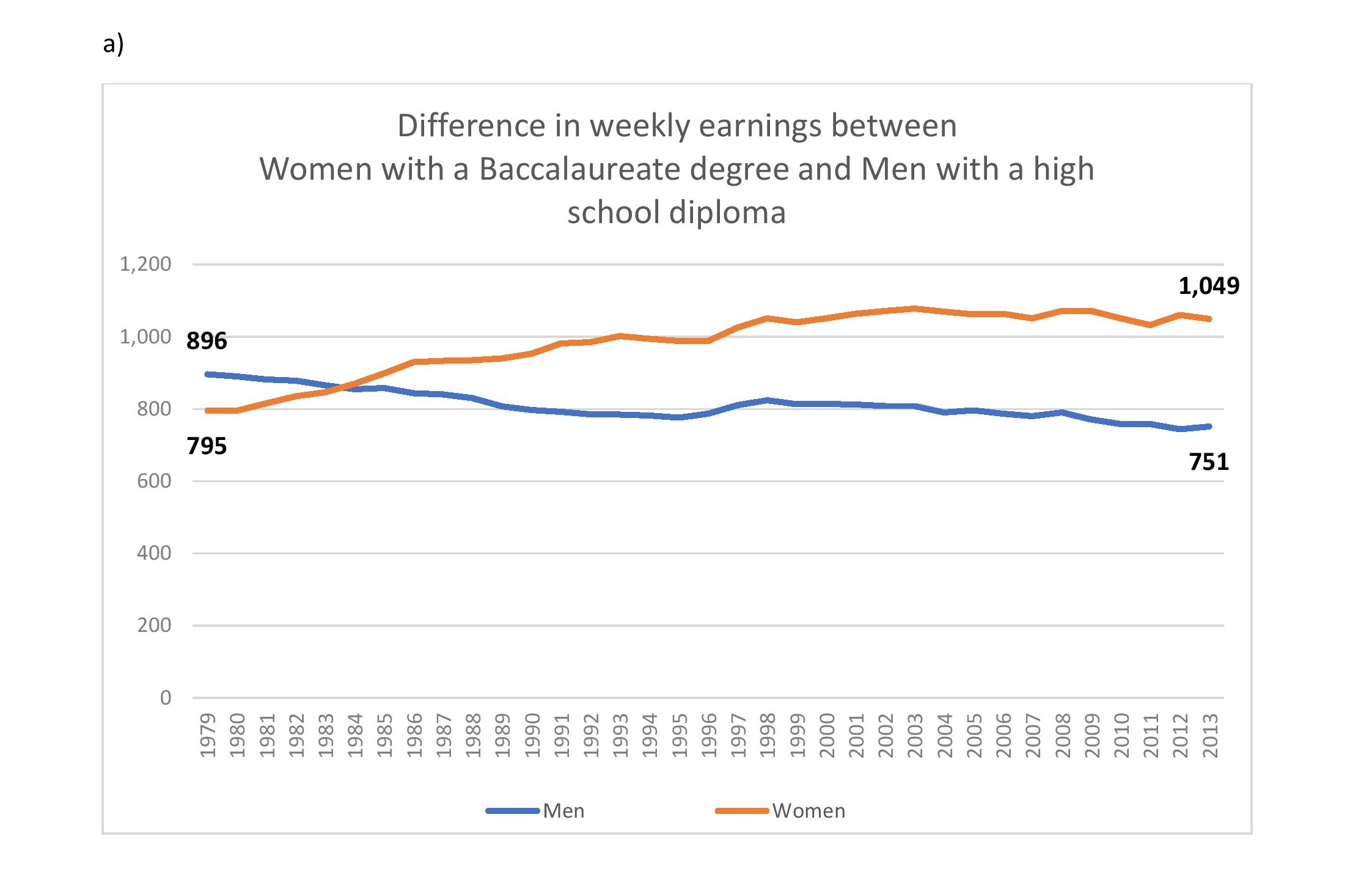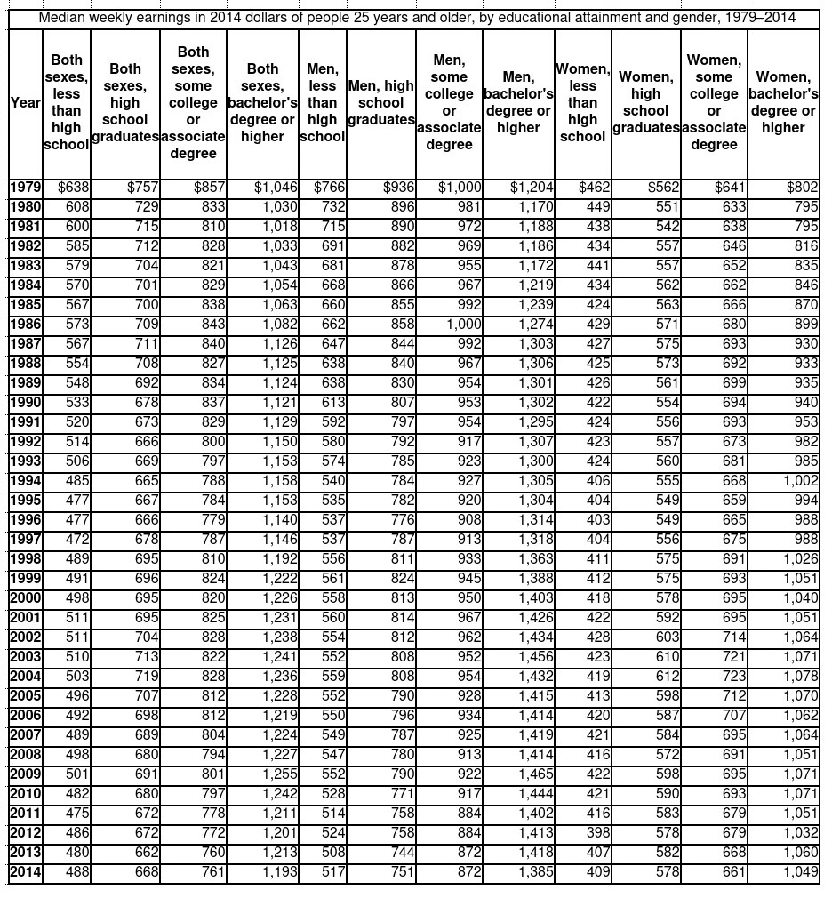 Median weekly earnings in 2014 dollars of people 25 years and older...