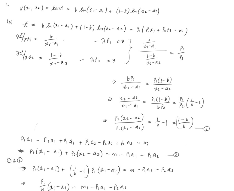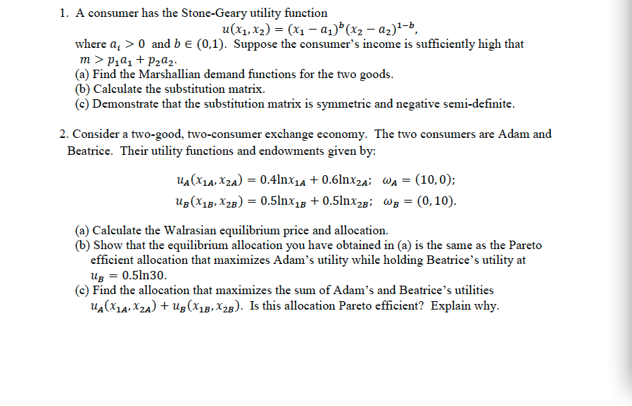 1. A consumer has the Stone-Geary utility function u(x1,x2) = (x1-...