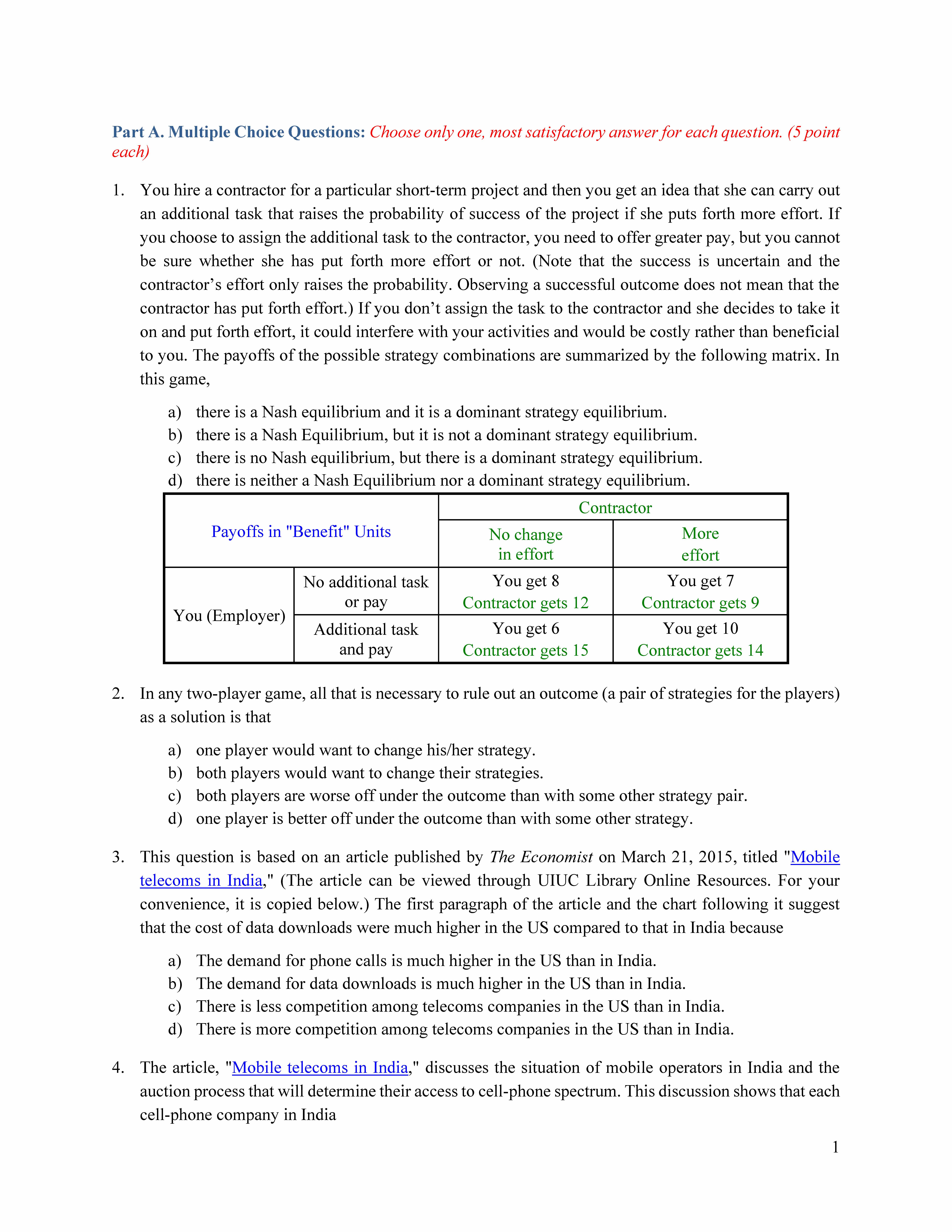 1 Part A. Multiple Choice Questions: Choose only one, most satisfa...