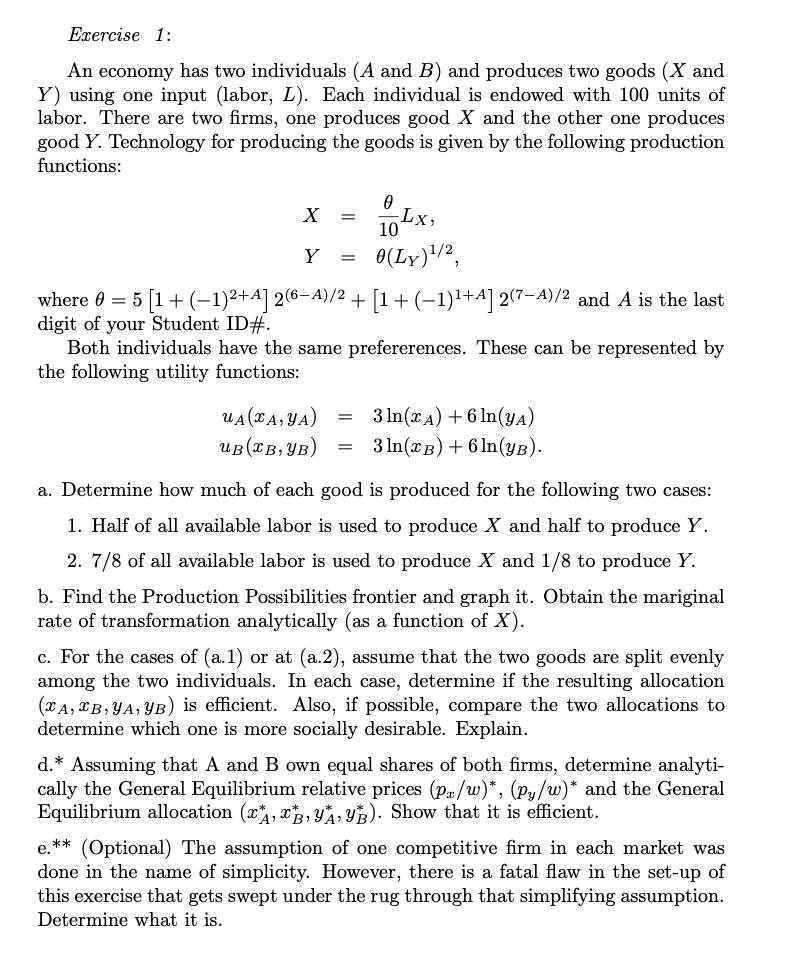 Exercise 1 An economy has two individuals (A and B) and produces t...