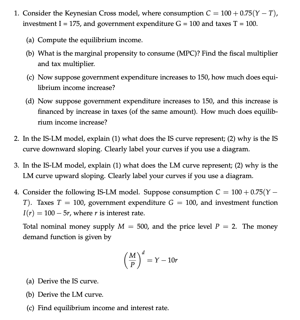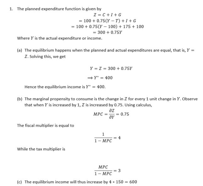 1. Consider the Keynesian Cross model, where consumption C = 100 +0...