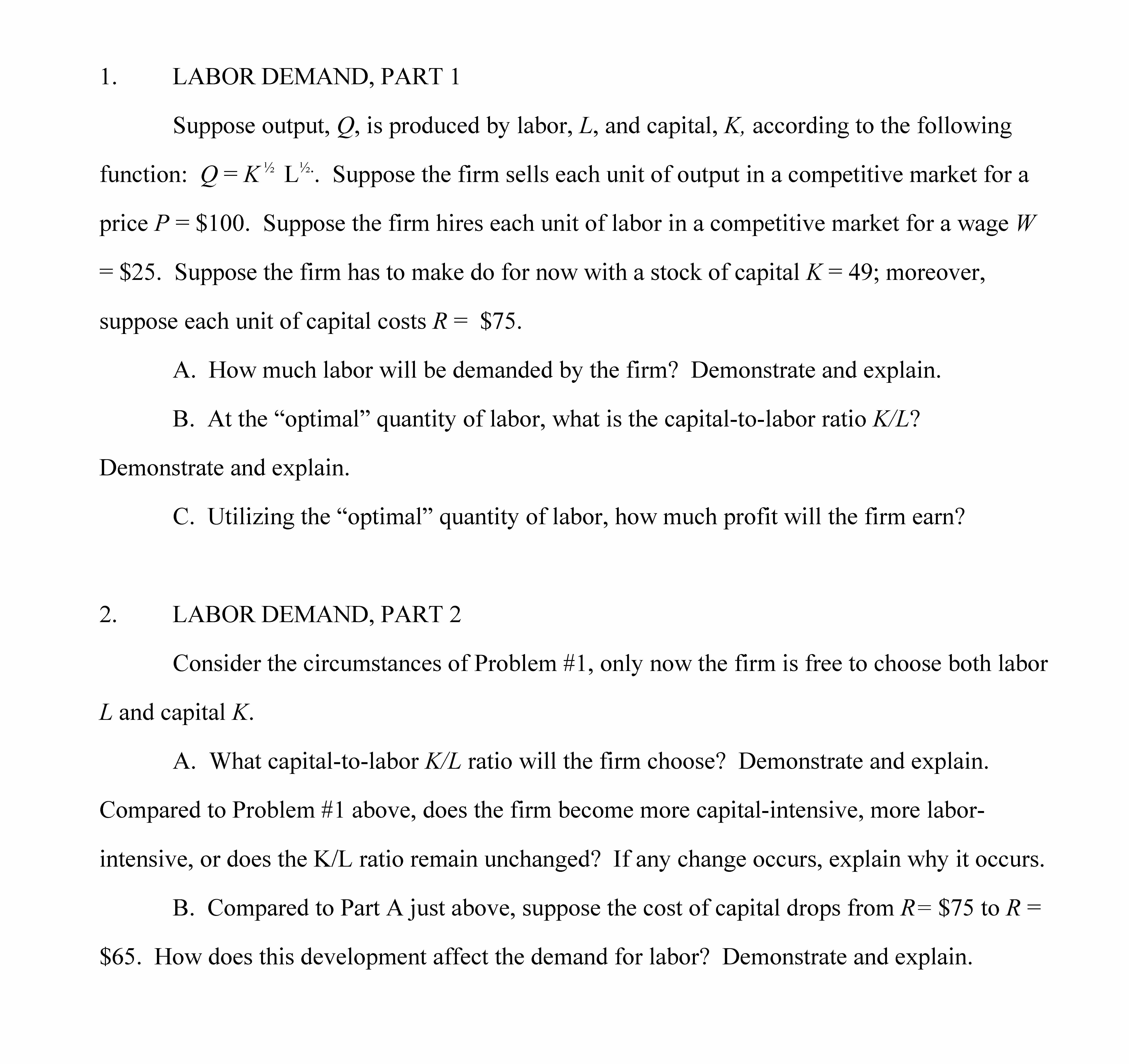 1. LABOR DEMAND, PART 1 Suppose output, Q. is produced by labor, ...