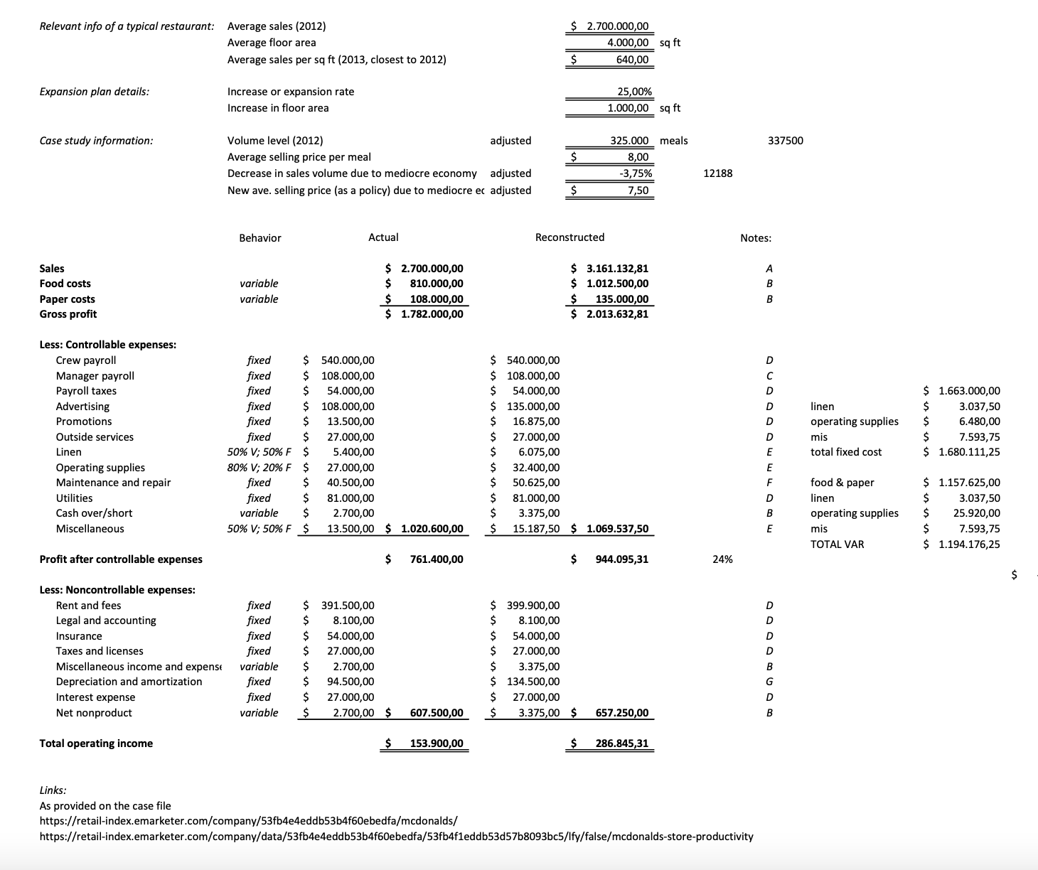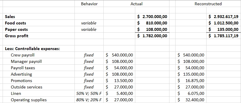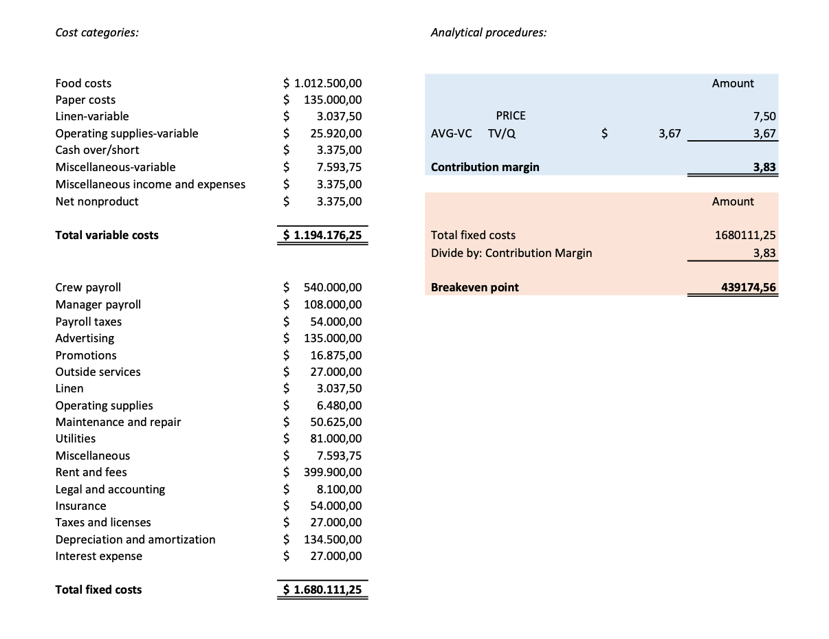 Cost categories: Analytical procedures: Food costs $ .012.500,00...