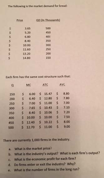 The following is the market demand for bread: Price QD (In Thousa...