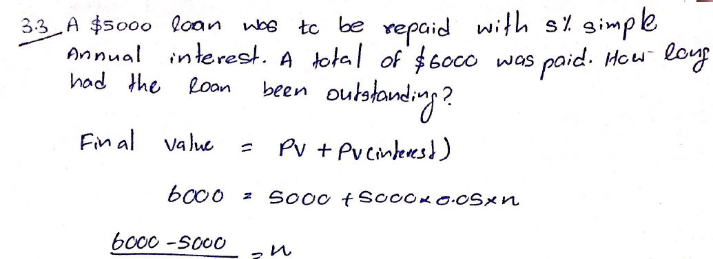 3-3 A $5000 loan was to be repaid with 5% simple annual interest. A...