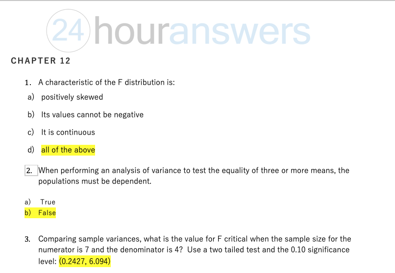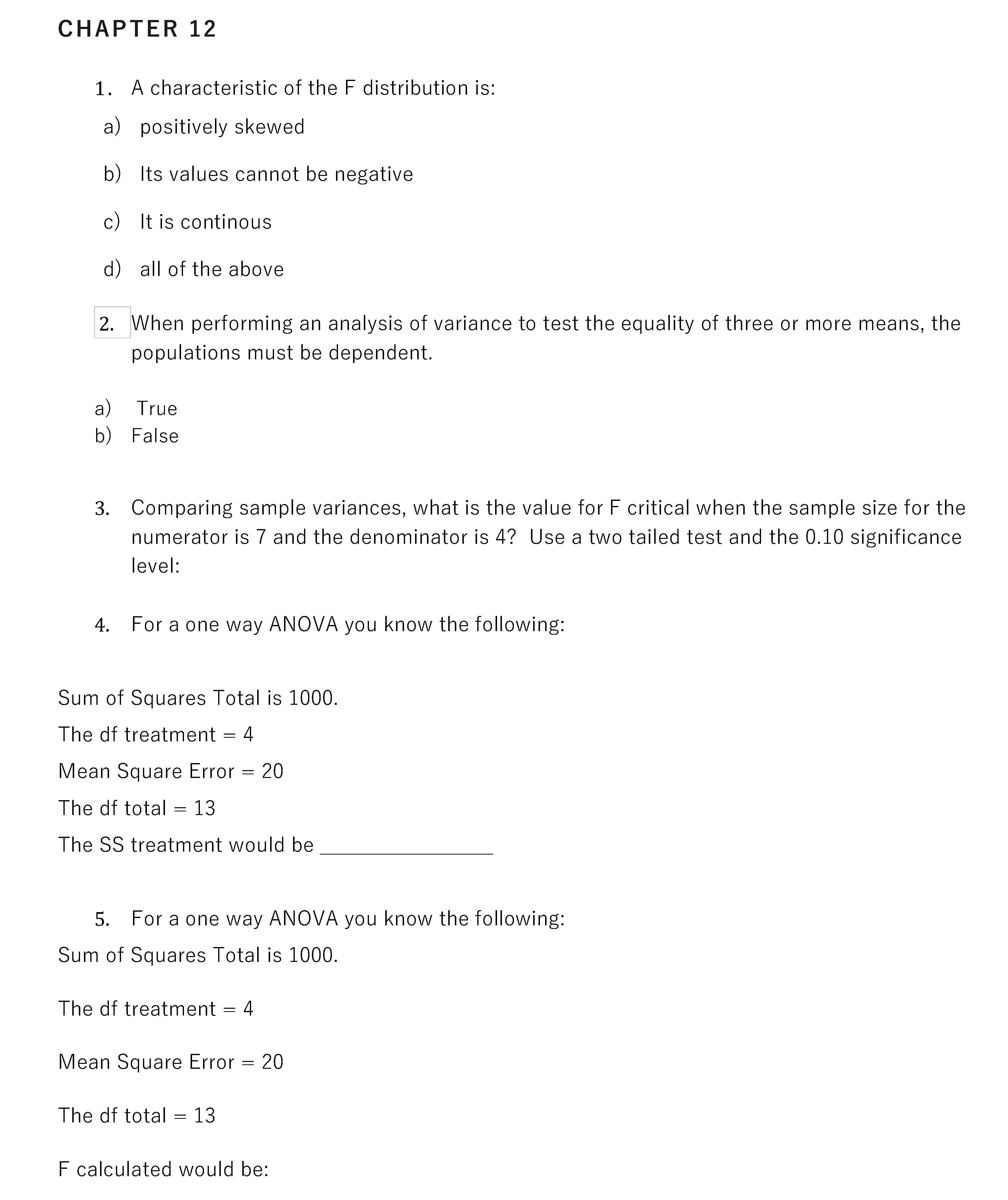 CHAPTER 12 1. A characteristic of the F distribution is: a) posit...