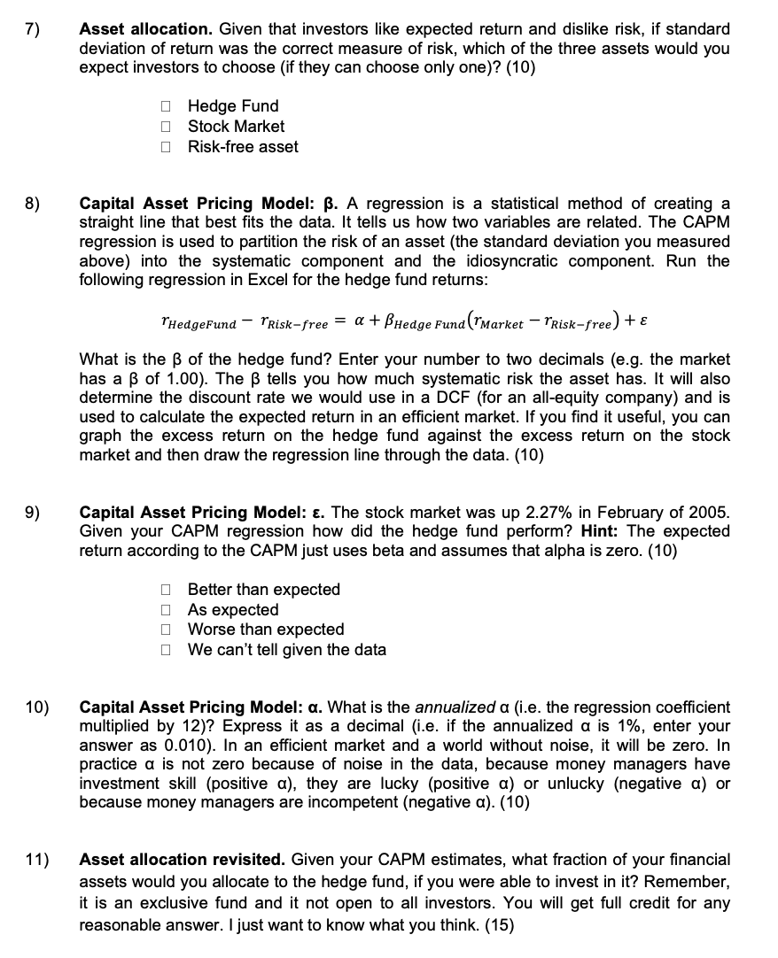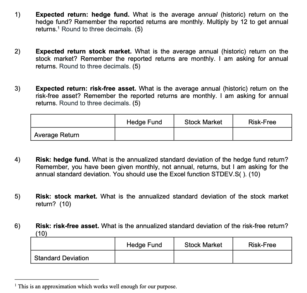 1) Expected return: hedge fund. What is the average annual (histor...