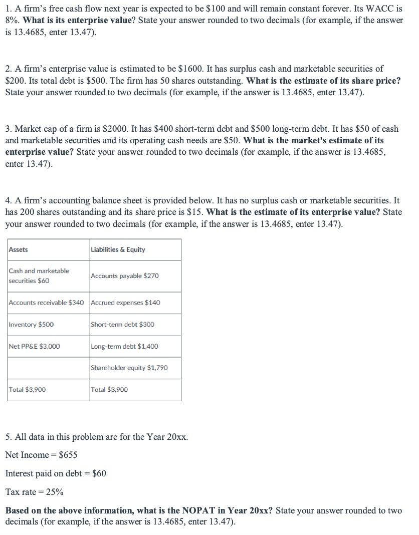 1. A firm's free cash flow next year is expected to be $100 and wil...