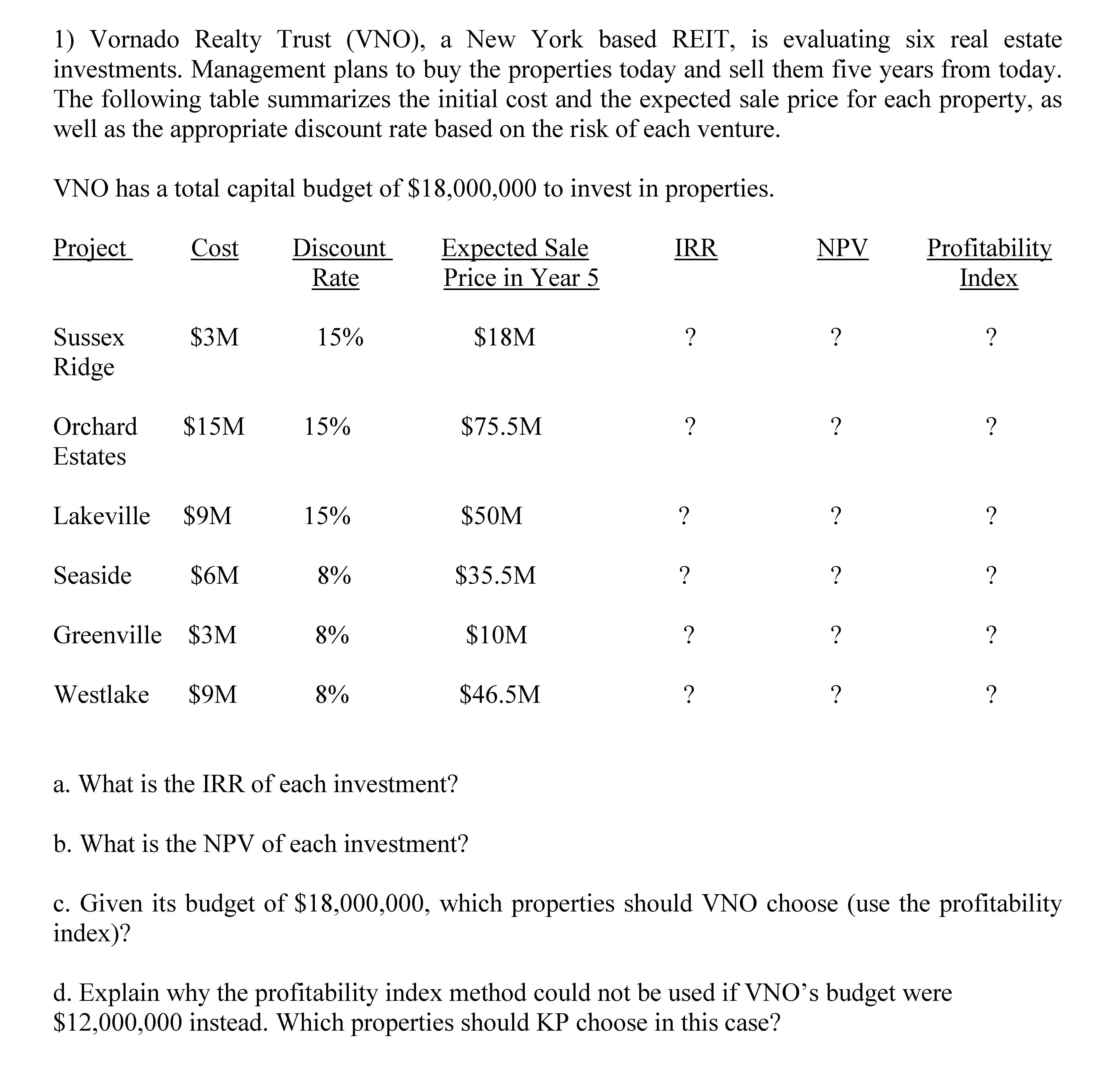 1) Vornado Realty Trust (VNO), a New York based REIT. is evaluating...