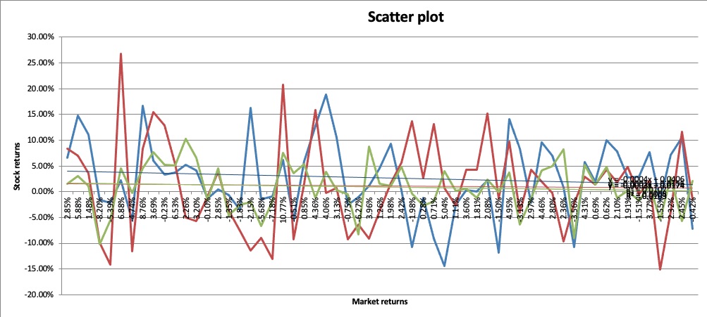 • Plot scatter diagrams for the returns of your 3 stocks against...