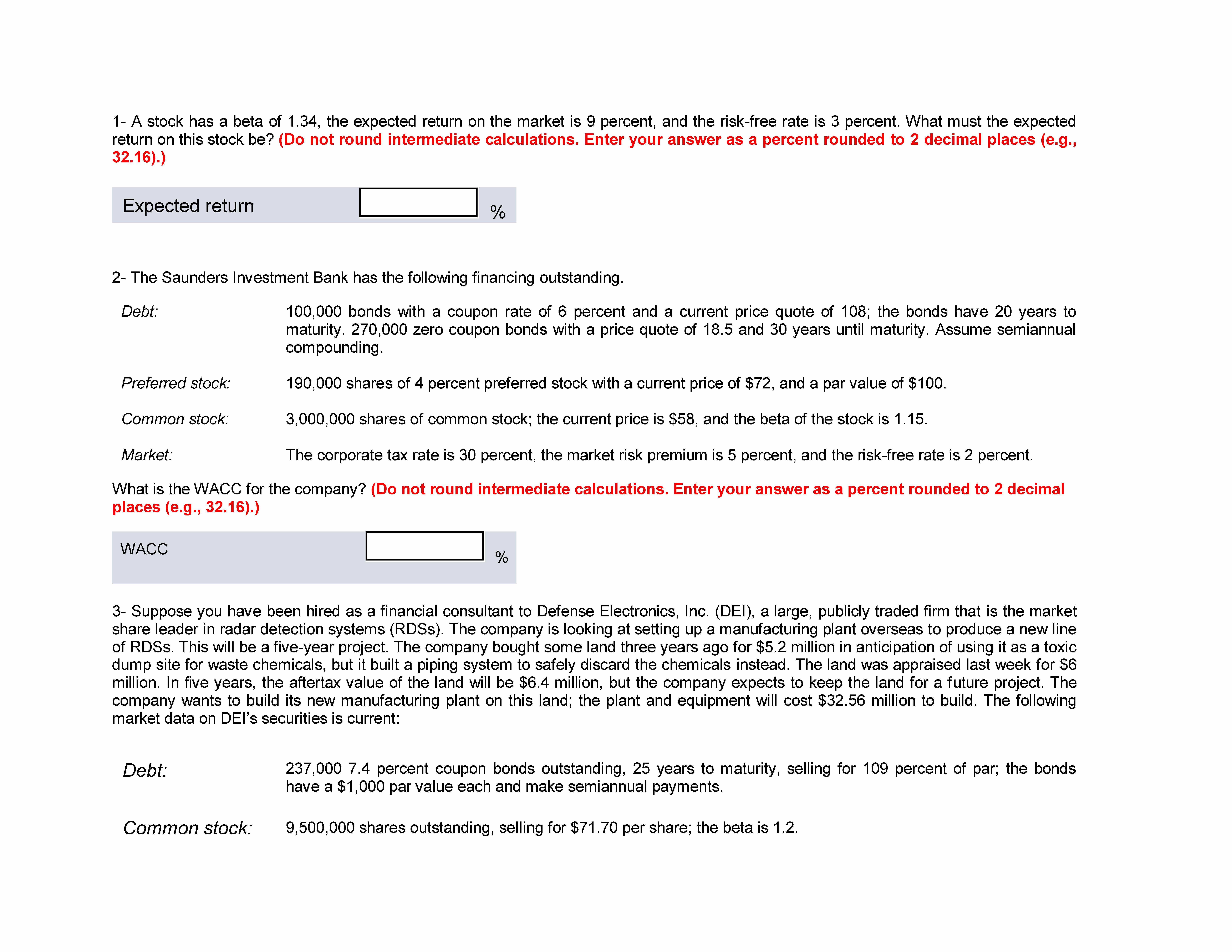 1- A stock has a beta of 1.34, the expected return on the market is...