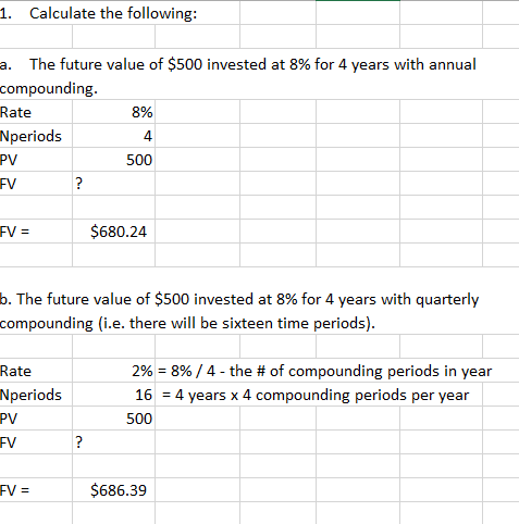 1. Calculate the following: a. The future value of $500 invested...