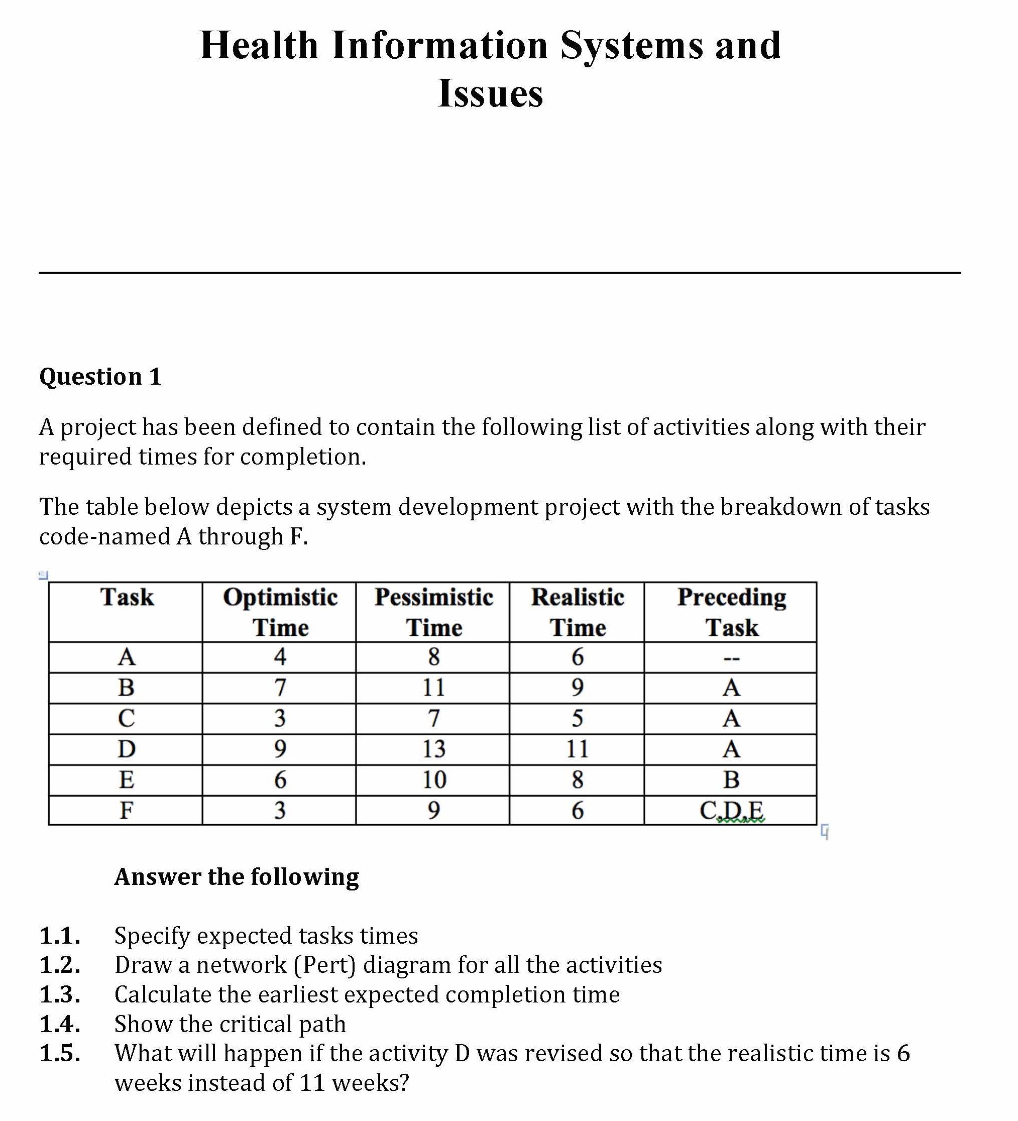1 Health Information Systems and Issues Question 1 A project ha...