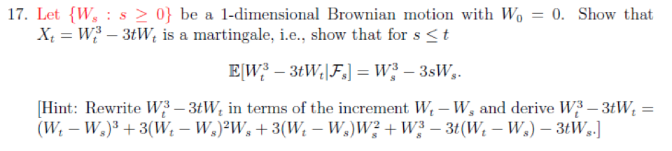 17. Let {Ws : S > 0} be a 1-dimensional Brownian motion with Wo...