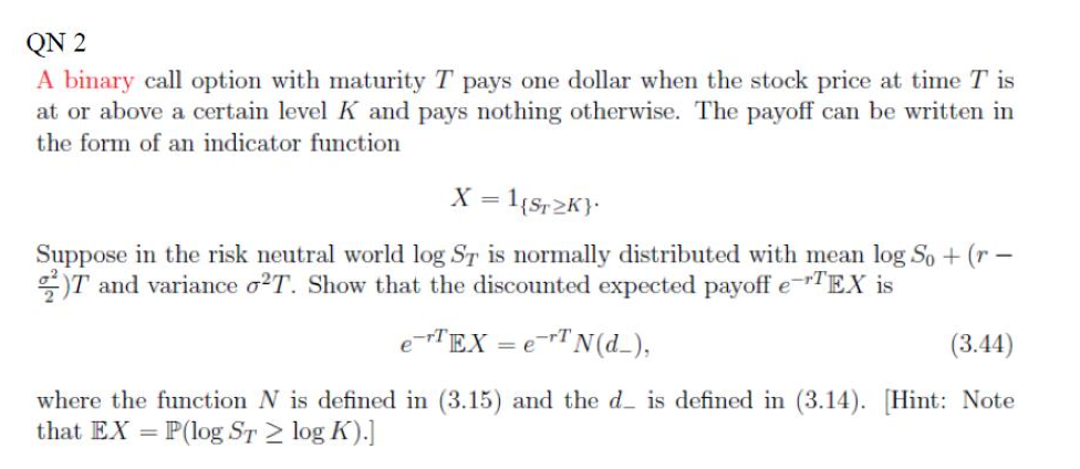 QN 2 A binary call option with maturity T pays one dollar when th...