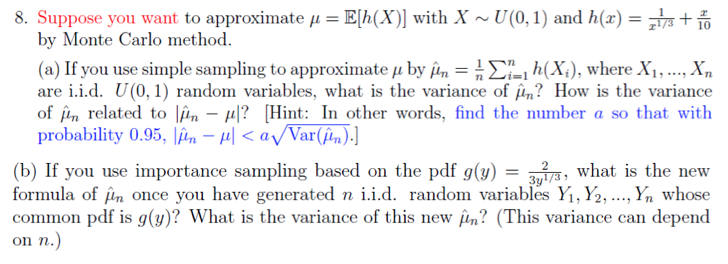 8. Suppose you want to approximate H = E[h(X)] with X ~ U(0,1) and ...
