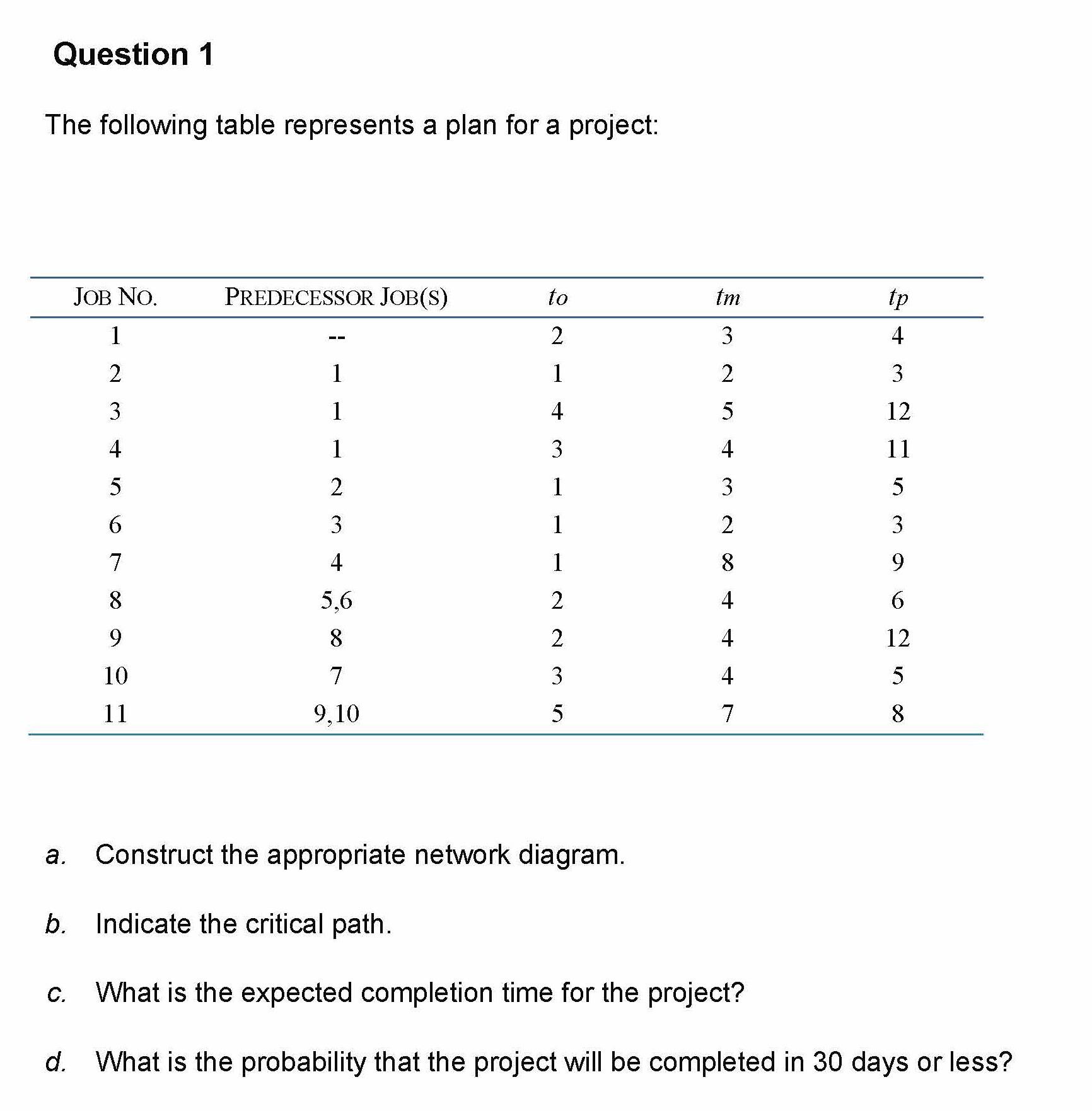 Question 1 The following table represents a plan for a project: J...