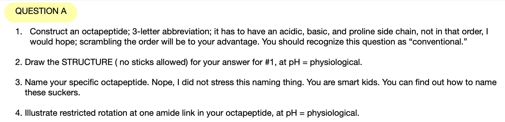 QUESTION A 1. Construct an octapeptide; 3-letter abbreviation; it ...