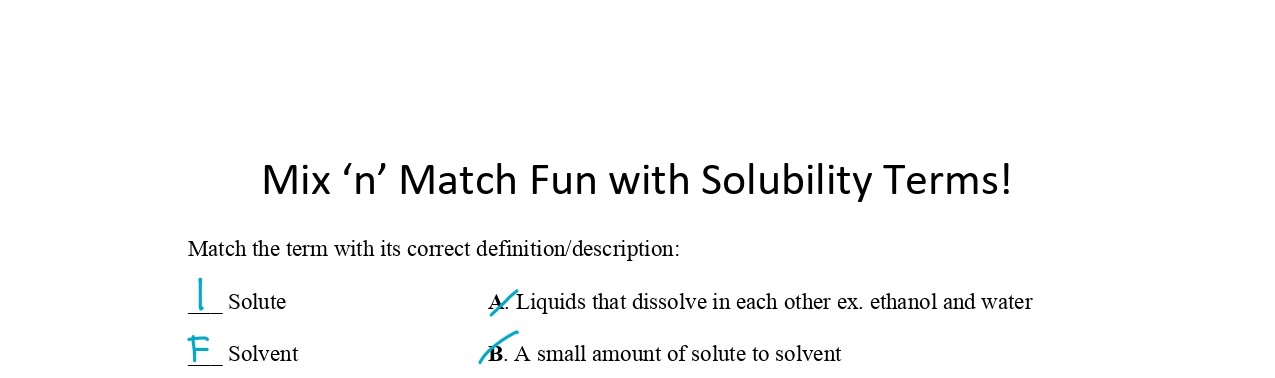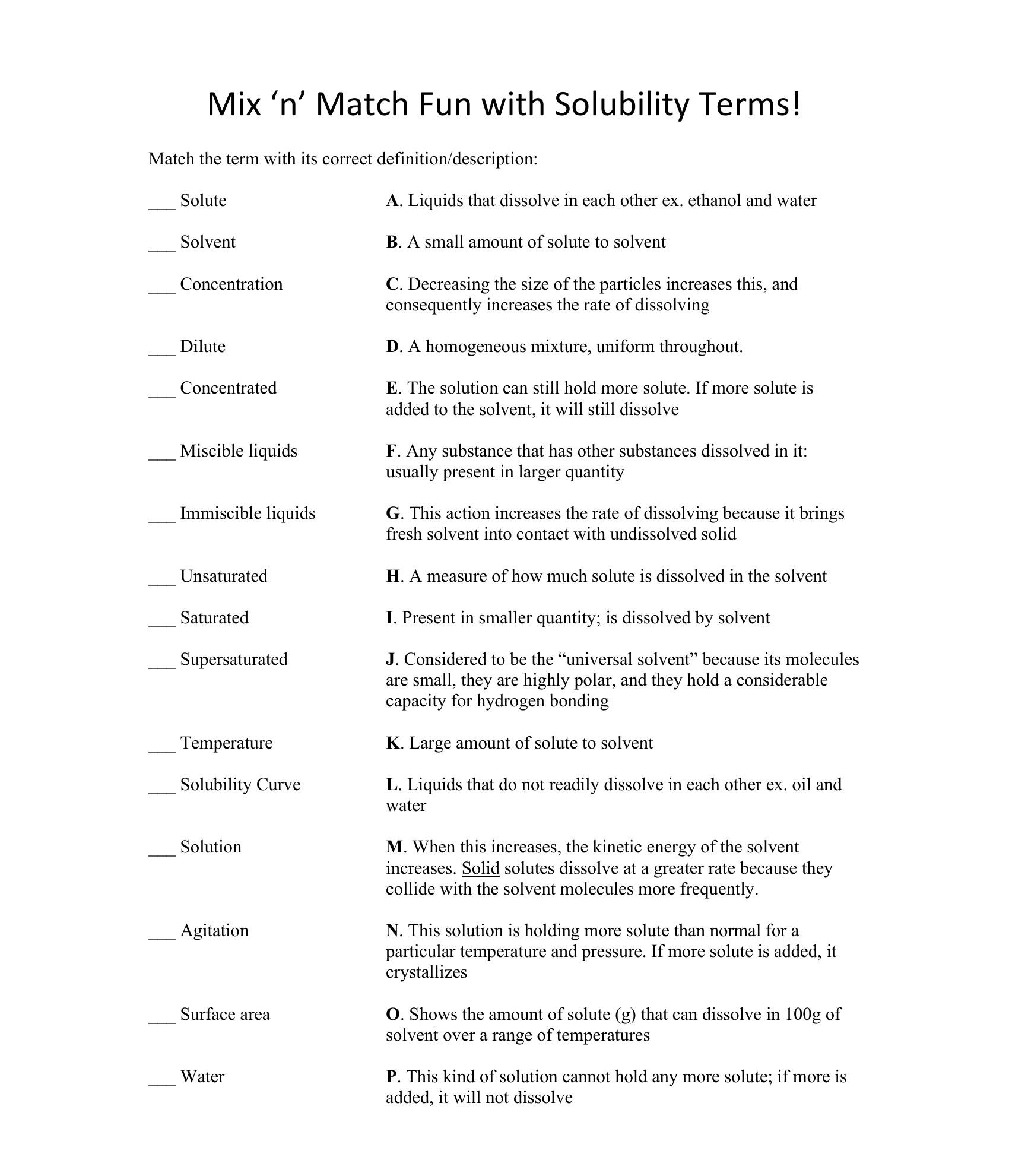Mix 'n' Match Fun with Solubility Terms! Match the term with its c...