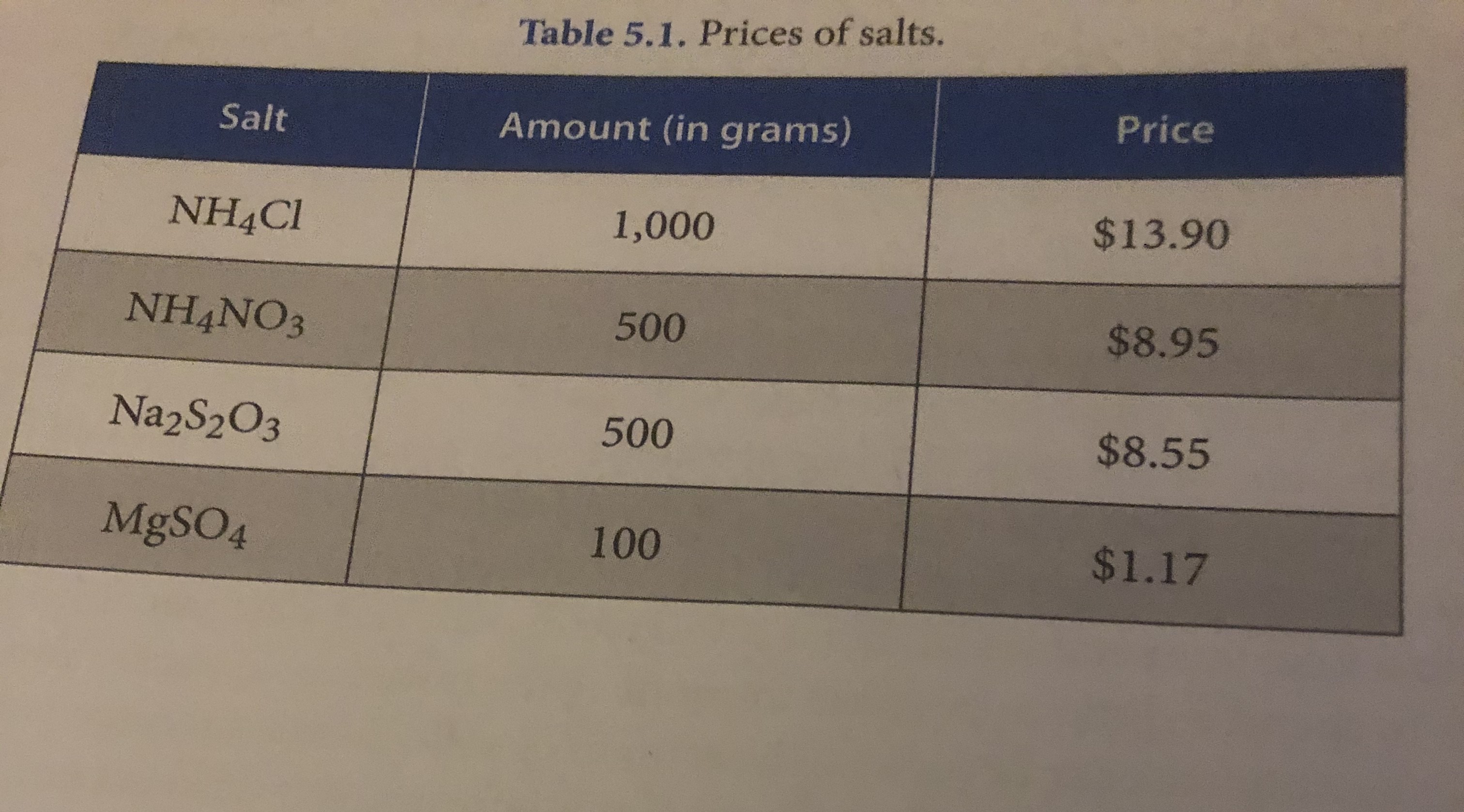 Table 5.1. Prices of salts. Salt Amount (in grams) Price NH4Cl...