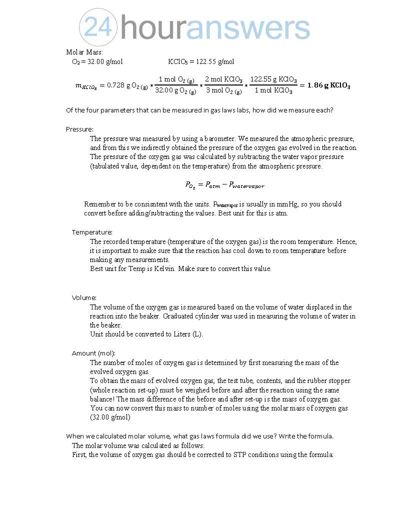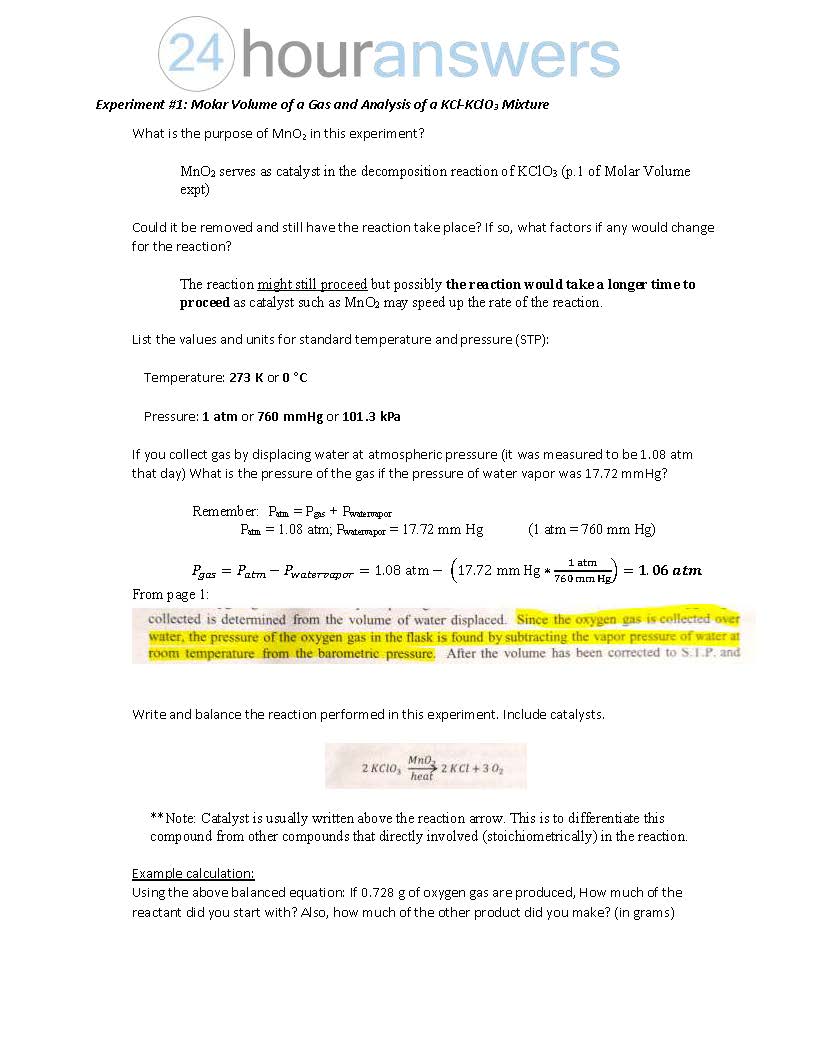 Experiment #1: Molar Volume of a Gas and Analysis of a KCl-KClO3 Mi...