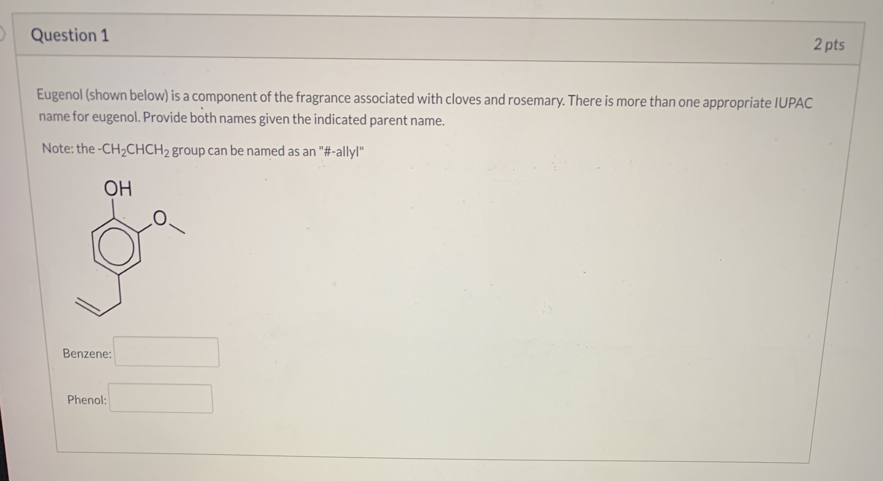 Question 1 2 pts Eugenol (shown below) is a component of the frag...
