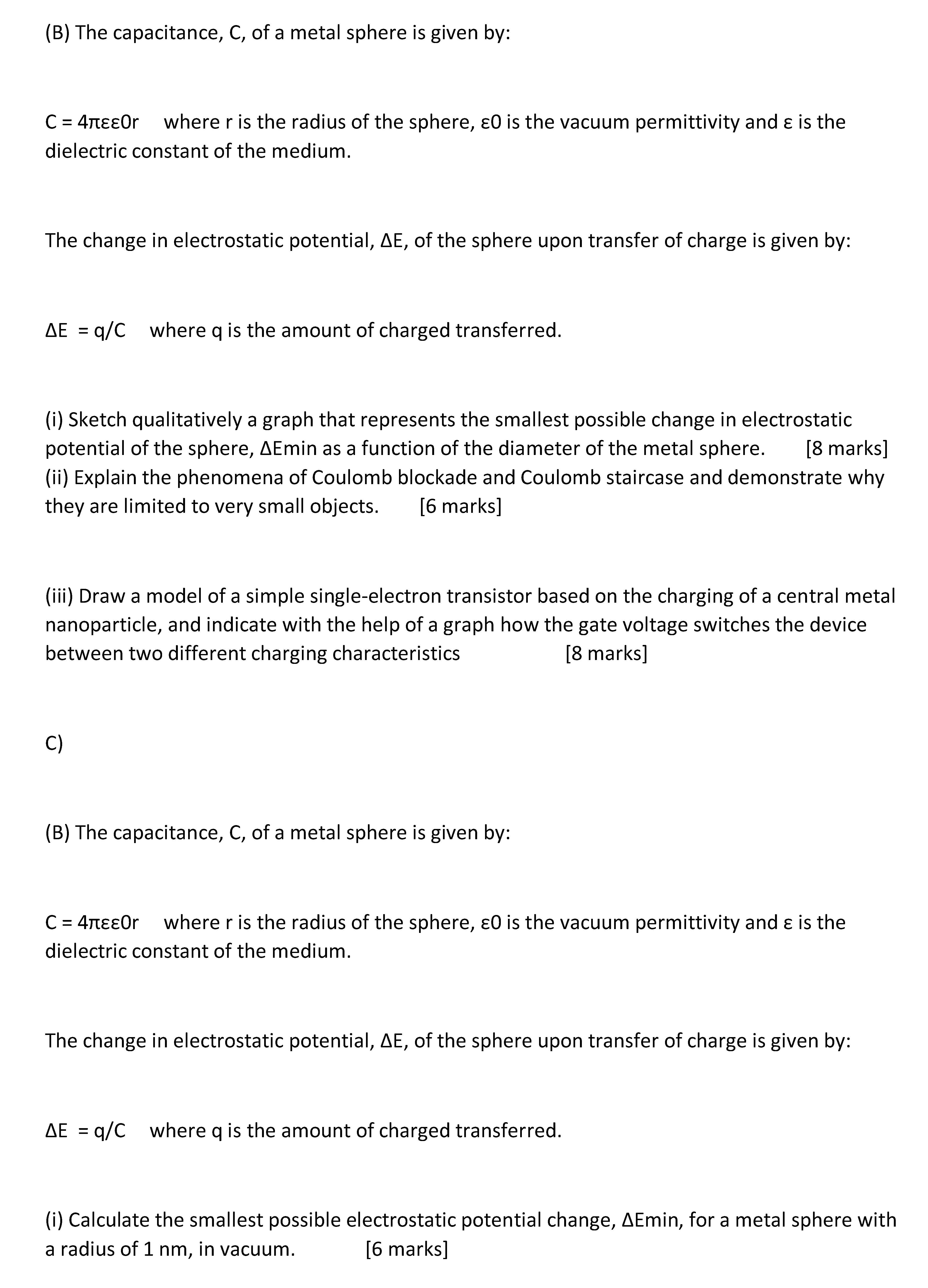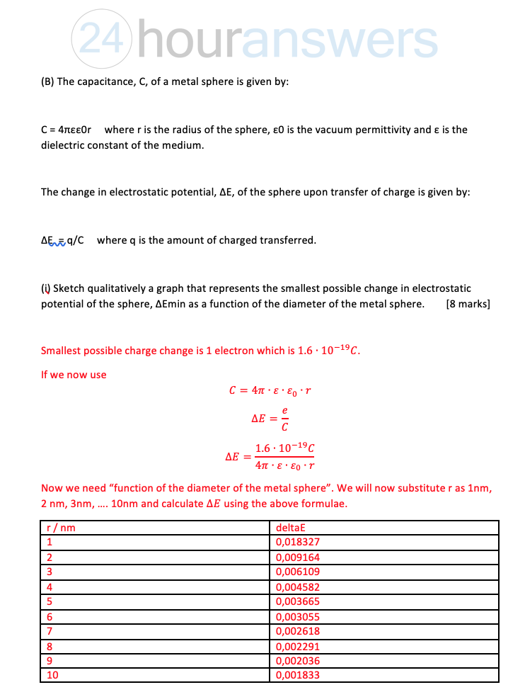 (B) The capacitance, C, of a metal sphere is given by: C = 4rtEEOr...