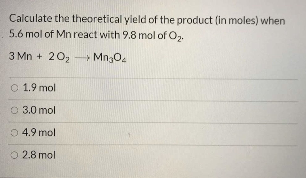 Calculate the theoretical yield of the product (in moles) when 5.6...