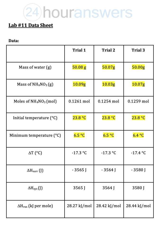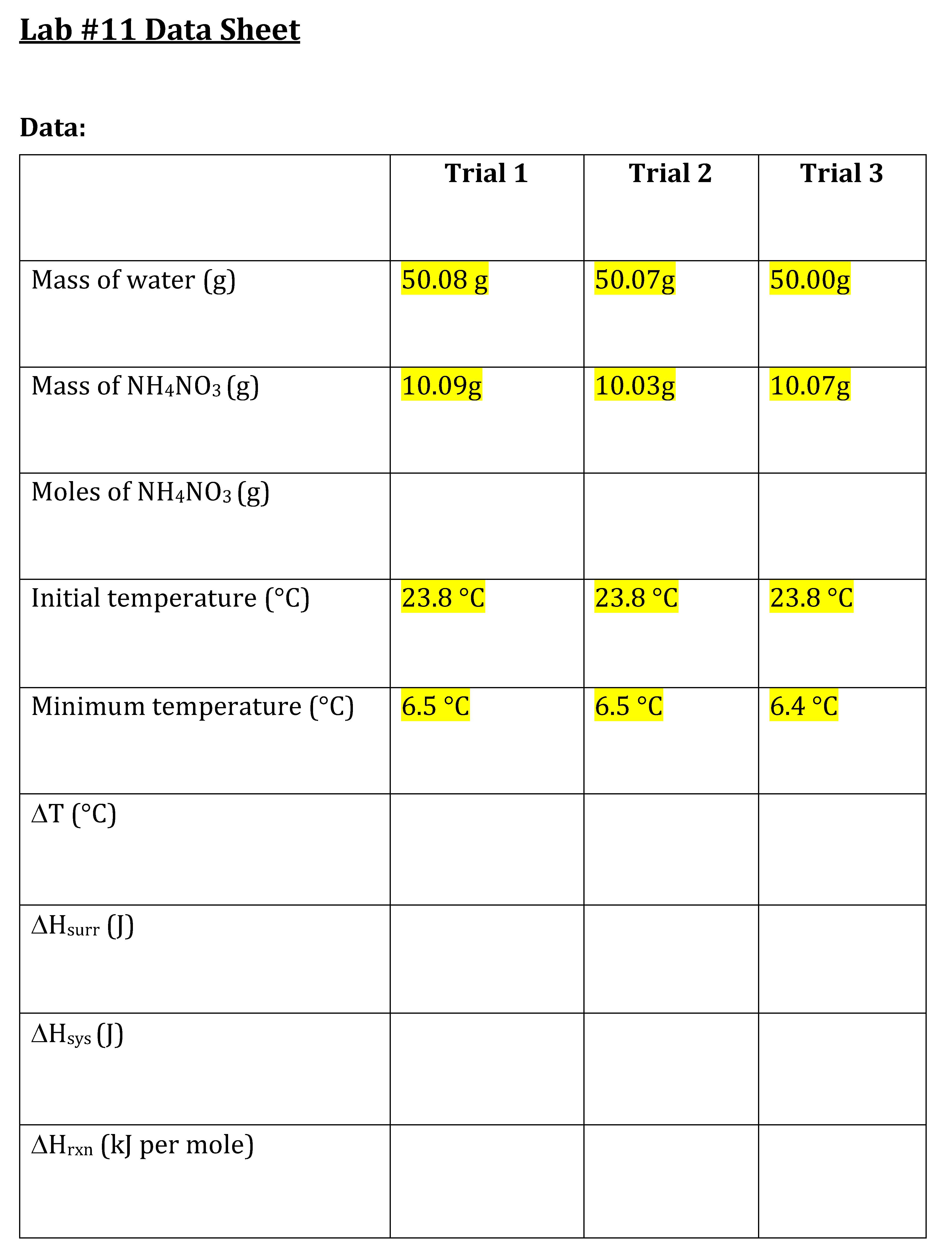 Lab #11 Data Sheet Data: Trial 1 Trial 2 Trial 3 Mass of water...