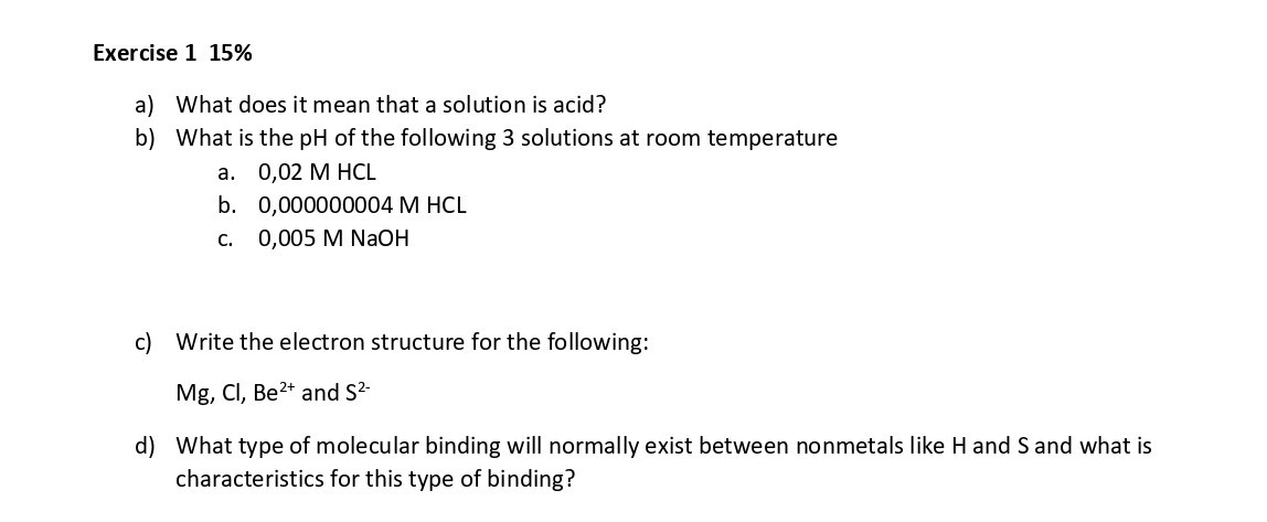 Exercise 1 15% a) What does it mean that a solution is acid? b) W...