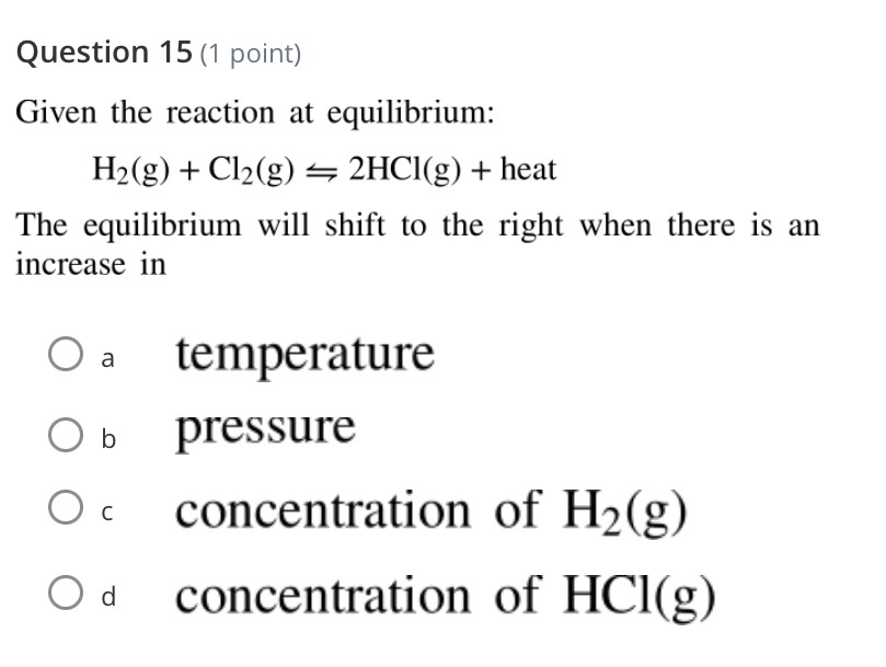 Question 15 (1 point) Given the reaction at equilibrium: H2(g) + ...