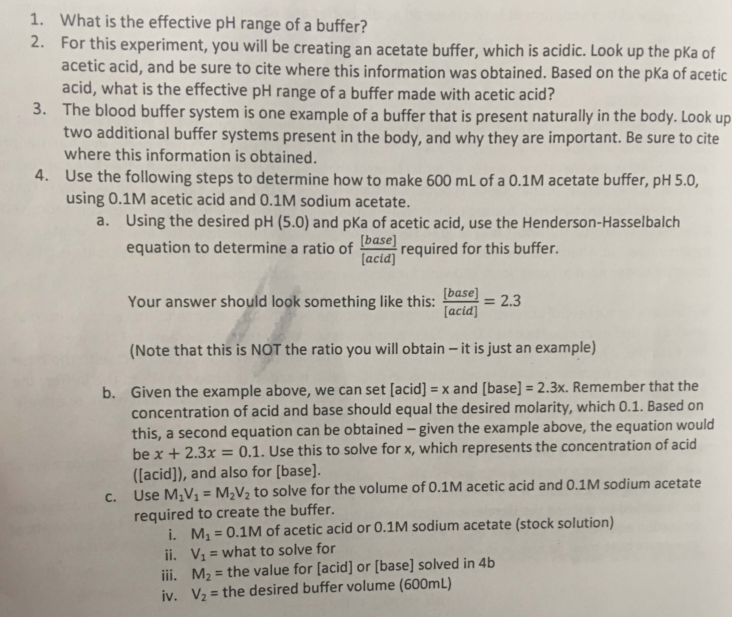1. What is the effective pH range of a buffer? 2. For this experi...