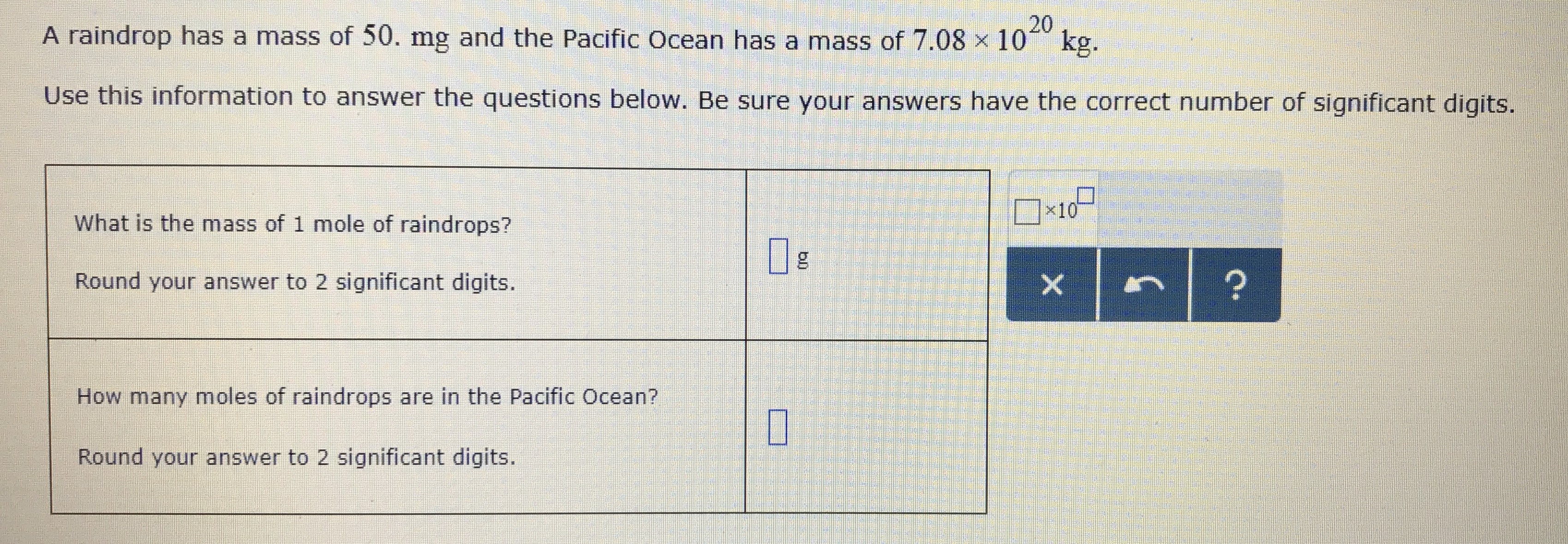 20 A raindrop has a mass of 50. mg and the Pacific Ocean has a mas...