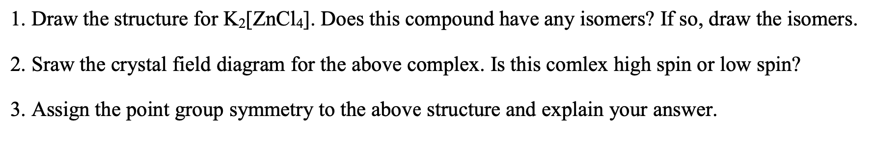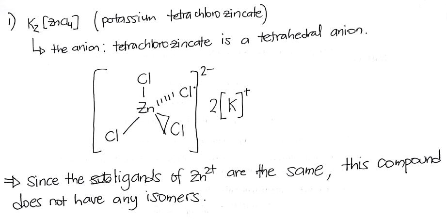 1. Draw the structure for K2[ZnCl4]. Does this compound have any is...