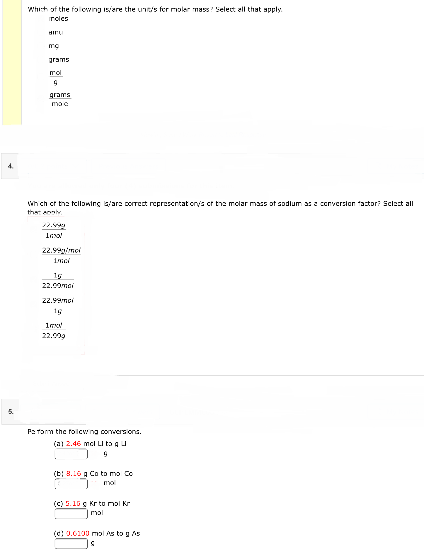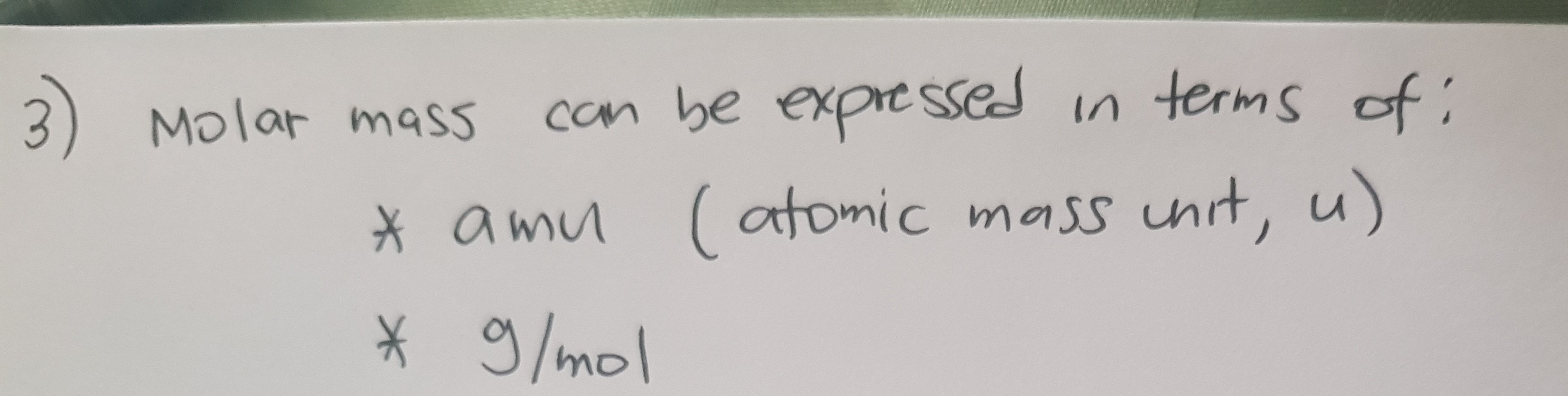 Which of the following is/are the unit/s for molar mass? Select all...