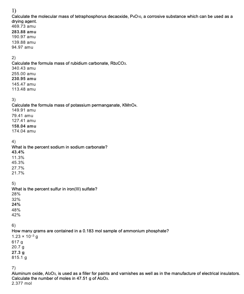 1) Calculate the molecular mass of tetraphosphorus decaoxide, P4O1...