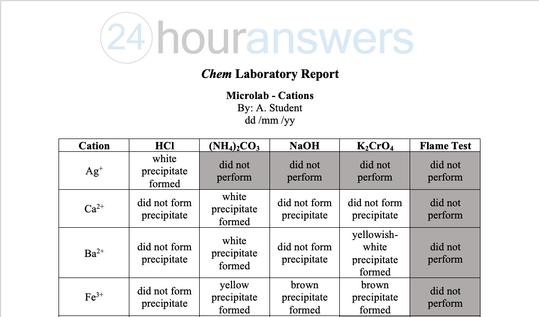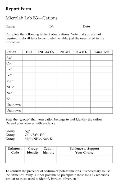Report Form Microlab Lab B3-Cations Name: ID#: Date: Complete ...