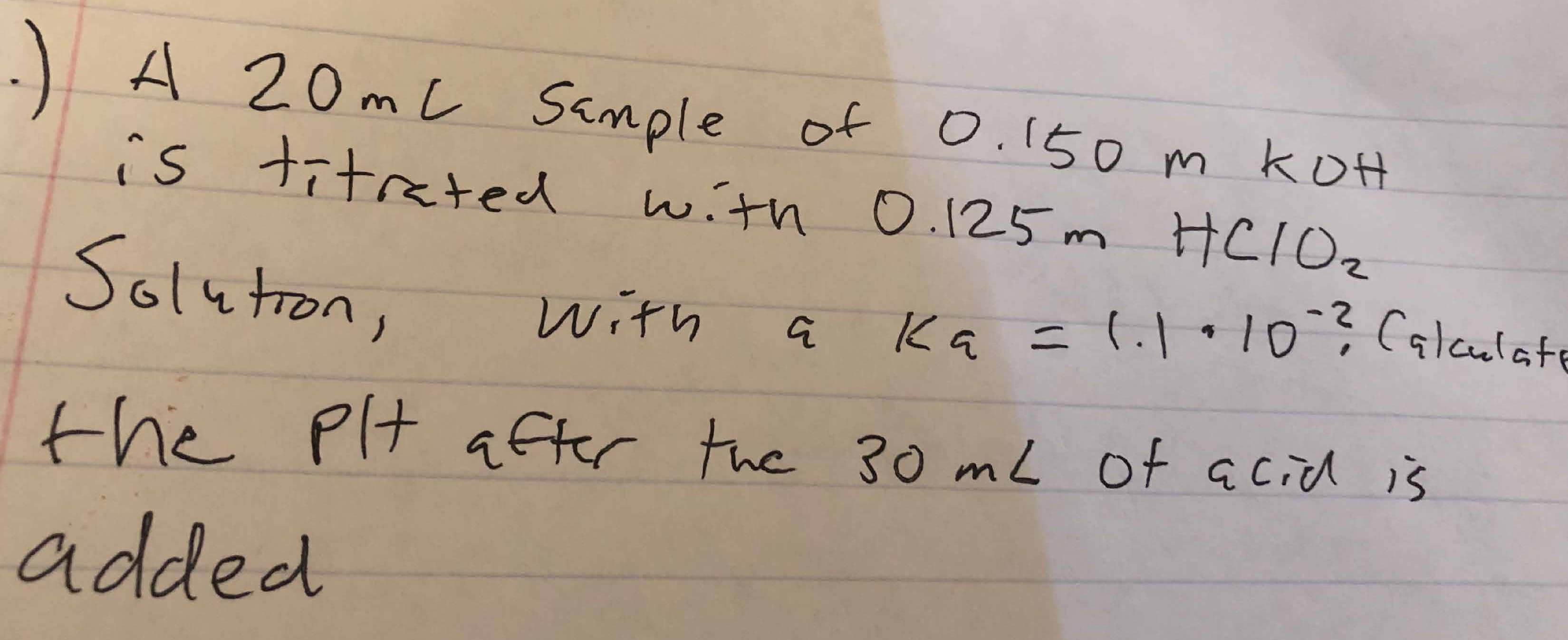 ) A 20mL Sample of 0.150 m KOH is titrated with 0.125m HC102 Sol...
