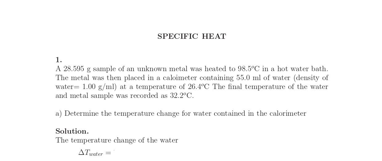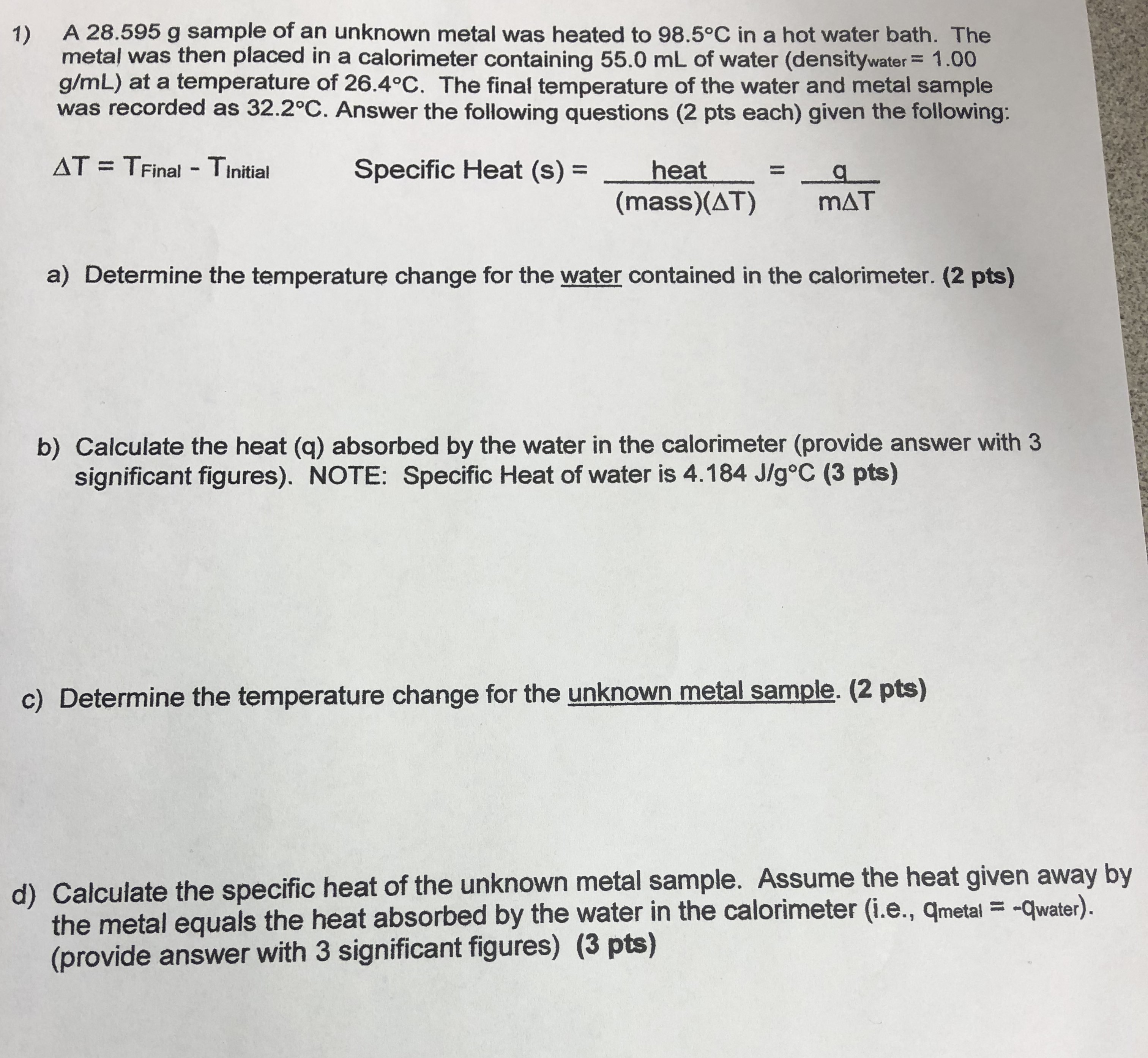 1) A 28.595 g sample of an unknown metal was heated to 98.5°C in...